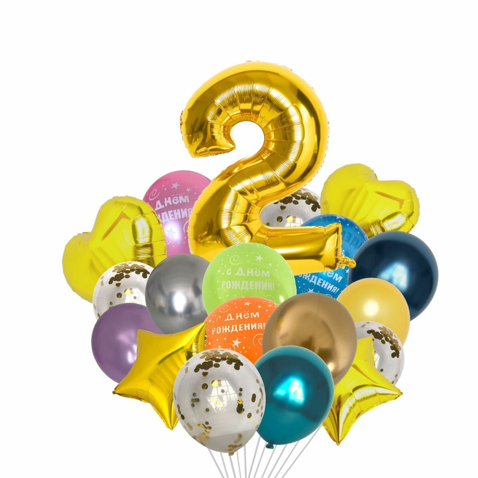 Купить Набор/букет воздушных шаров С днем рождения с цифрой "2" золото 21 штука