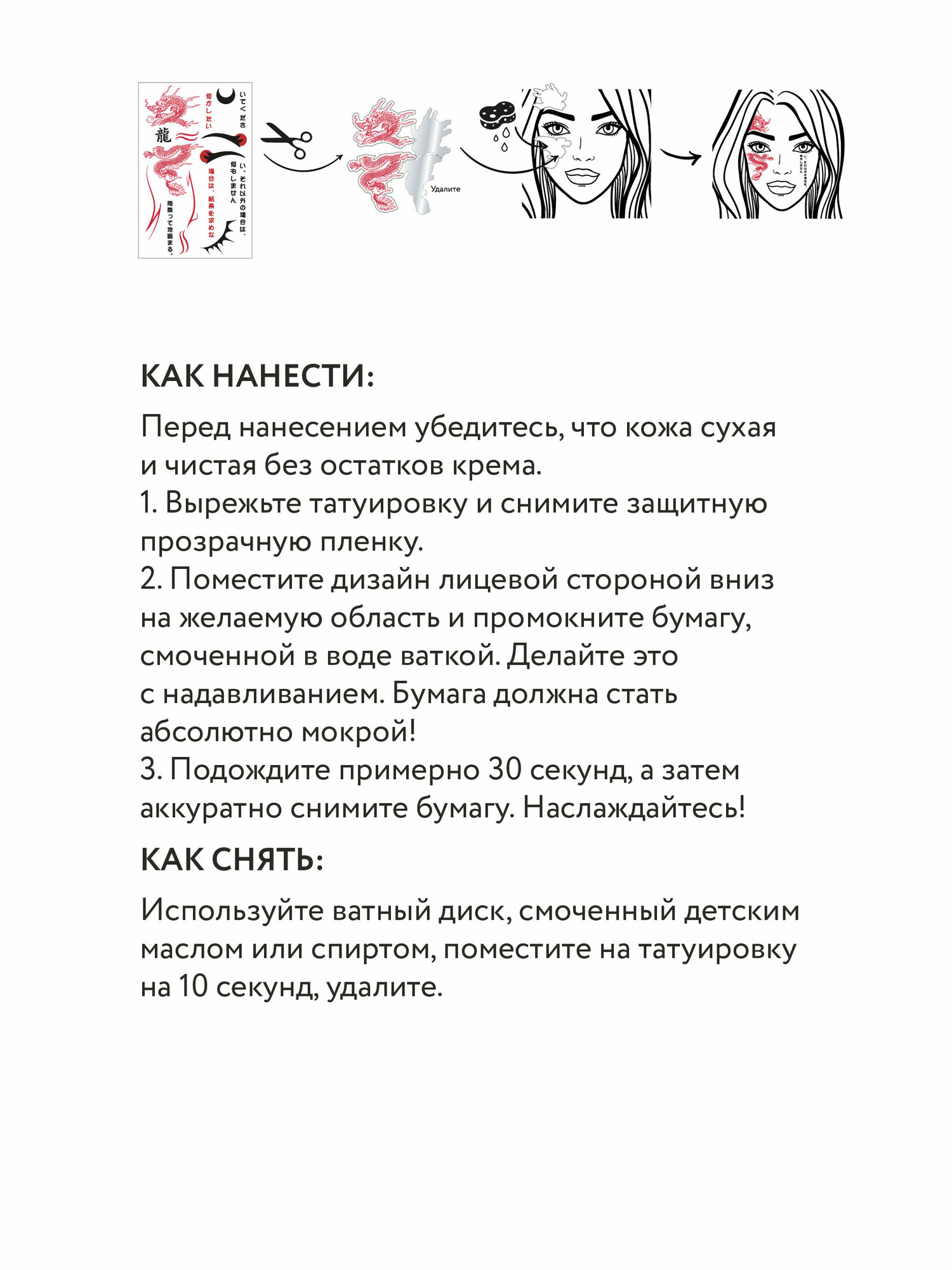 | Дополнительная информация | Как нанести тату? Способ применения: 1. Убедитесь, что ваша кожа сухая и чистая. 2. На ней не должно быть остатков масла или крема. 3. Аккуратно отрежьте татуировку, которую хотите нанести, и снимите с нее защитную пленку. 4. Приложите татуировку рисунком к коже. 5.Смочите татуировку влажным спонжем, так чтобы бумага полностью намокла. 6. Когда она намокнет, снимите ее. 7. Дайте высохнуть татуировке несколько минут, чтобы она надёжно закрепилась. Готово! |