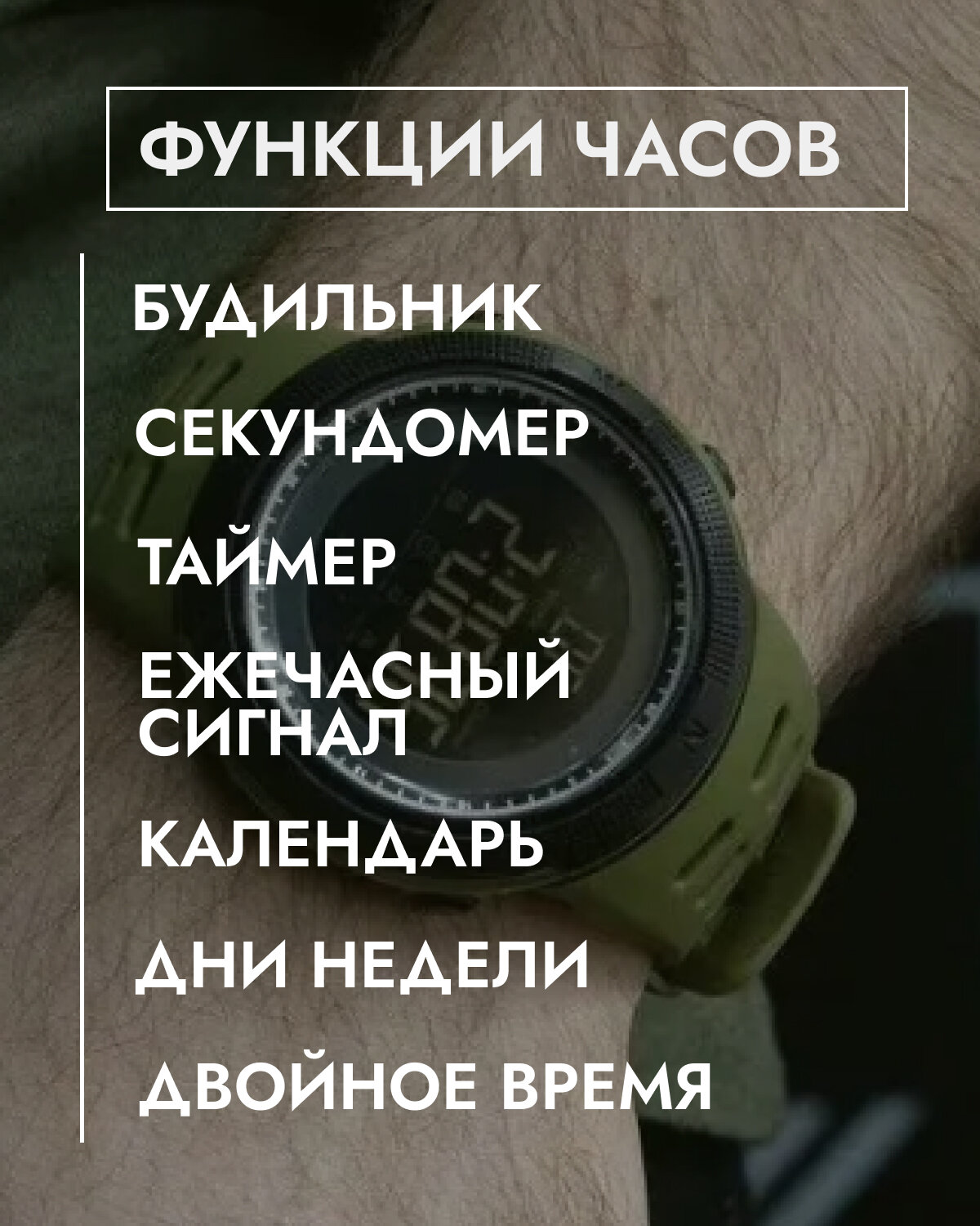 | Назначение часов | для бега / для рыбалки и охоты / для туризма и активного отдыха / тактические |