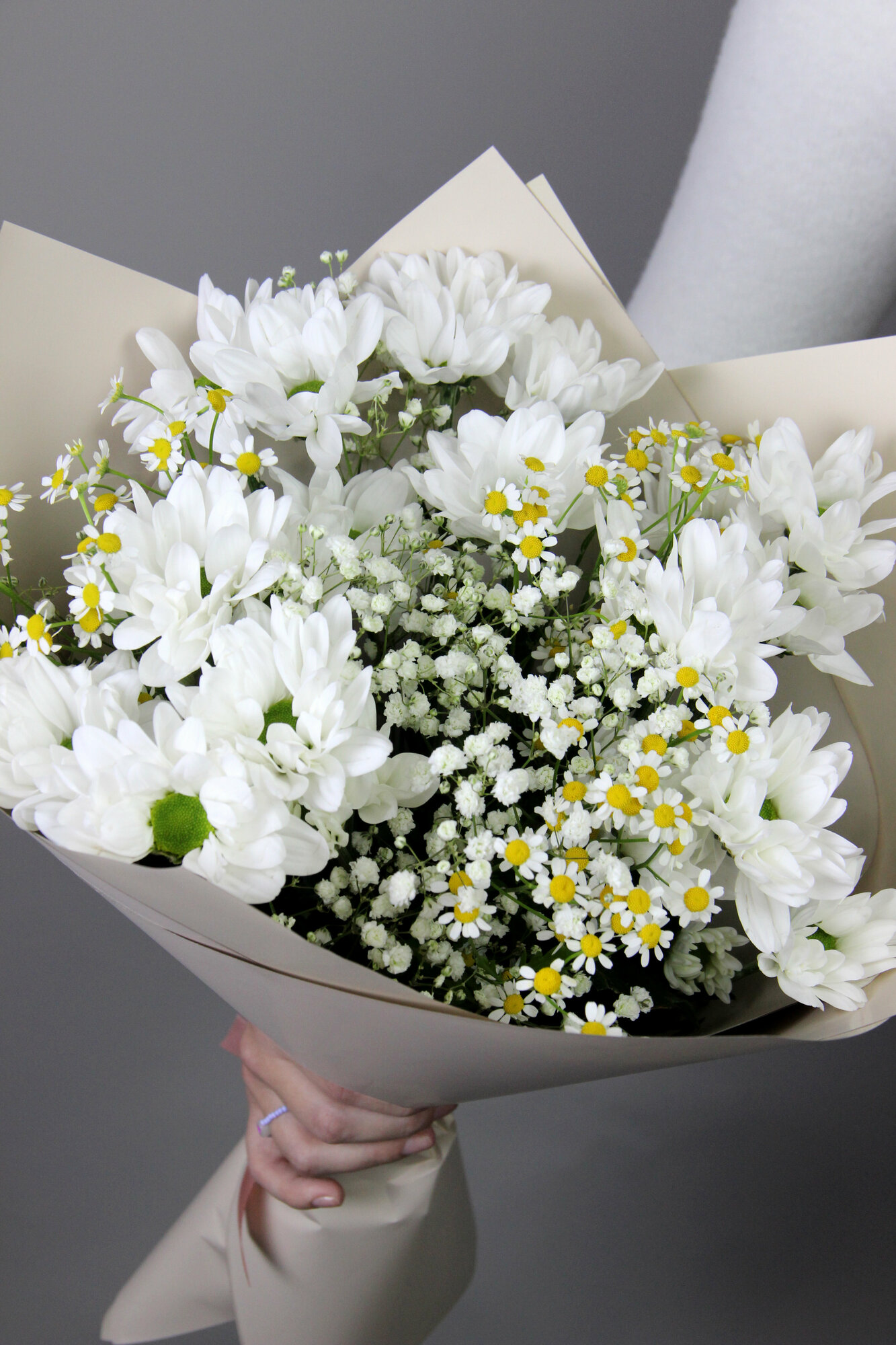 | Состав | хризантема кустовая; ромашки; гипсофила; упаковка |