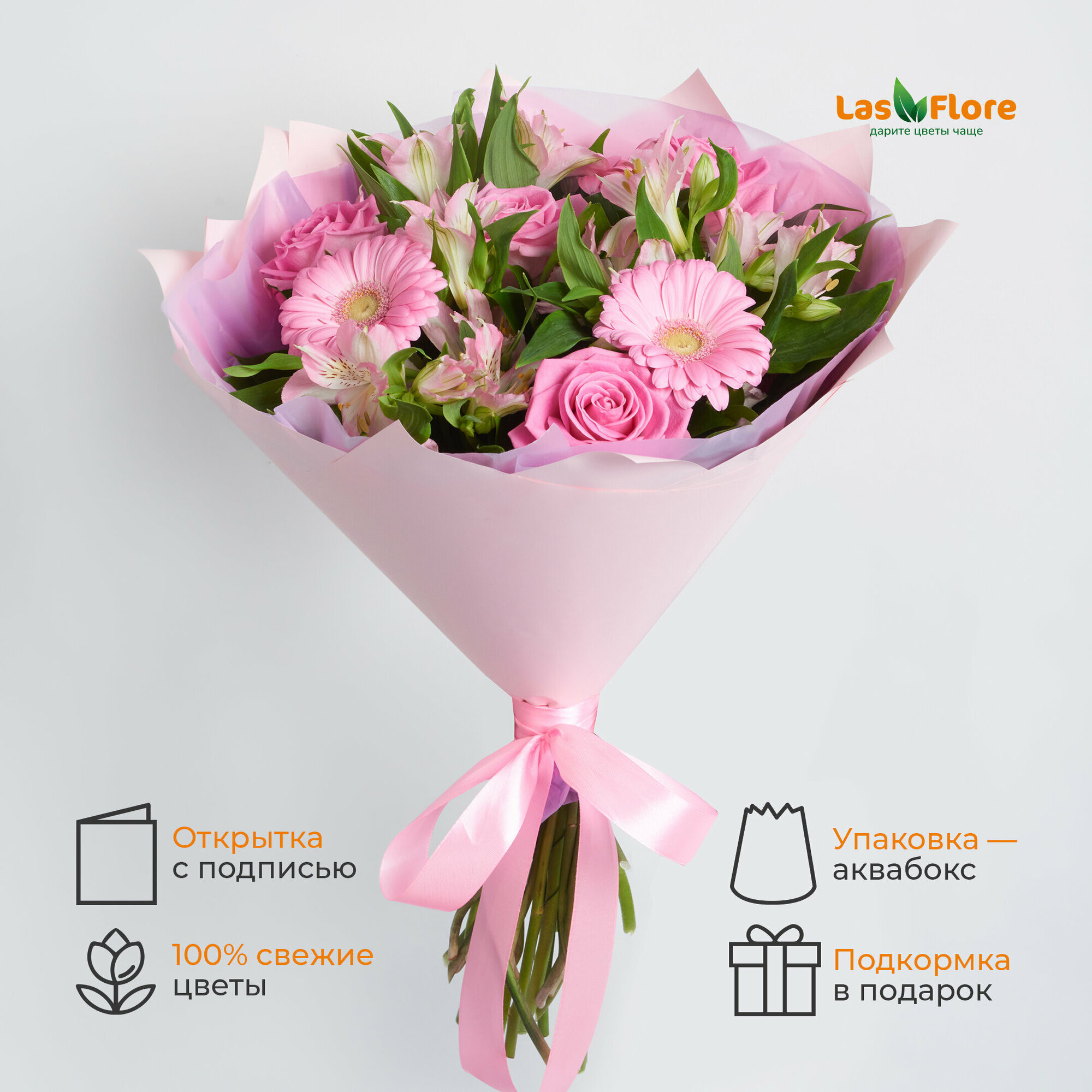 Букет живых цветов из роз, альстромерий и гербер Иветт интересное: