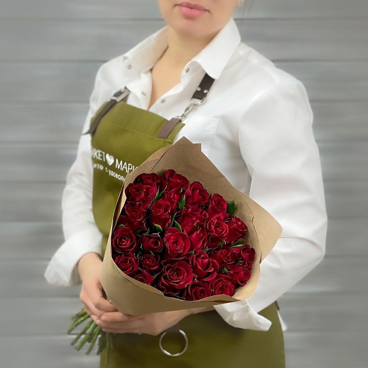 Купить Букет живых цветов из 21 красной розы 40см в крафте