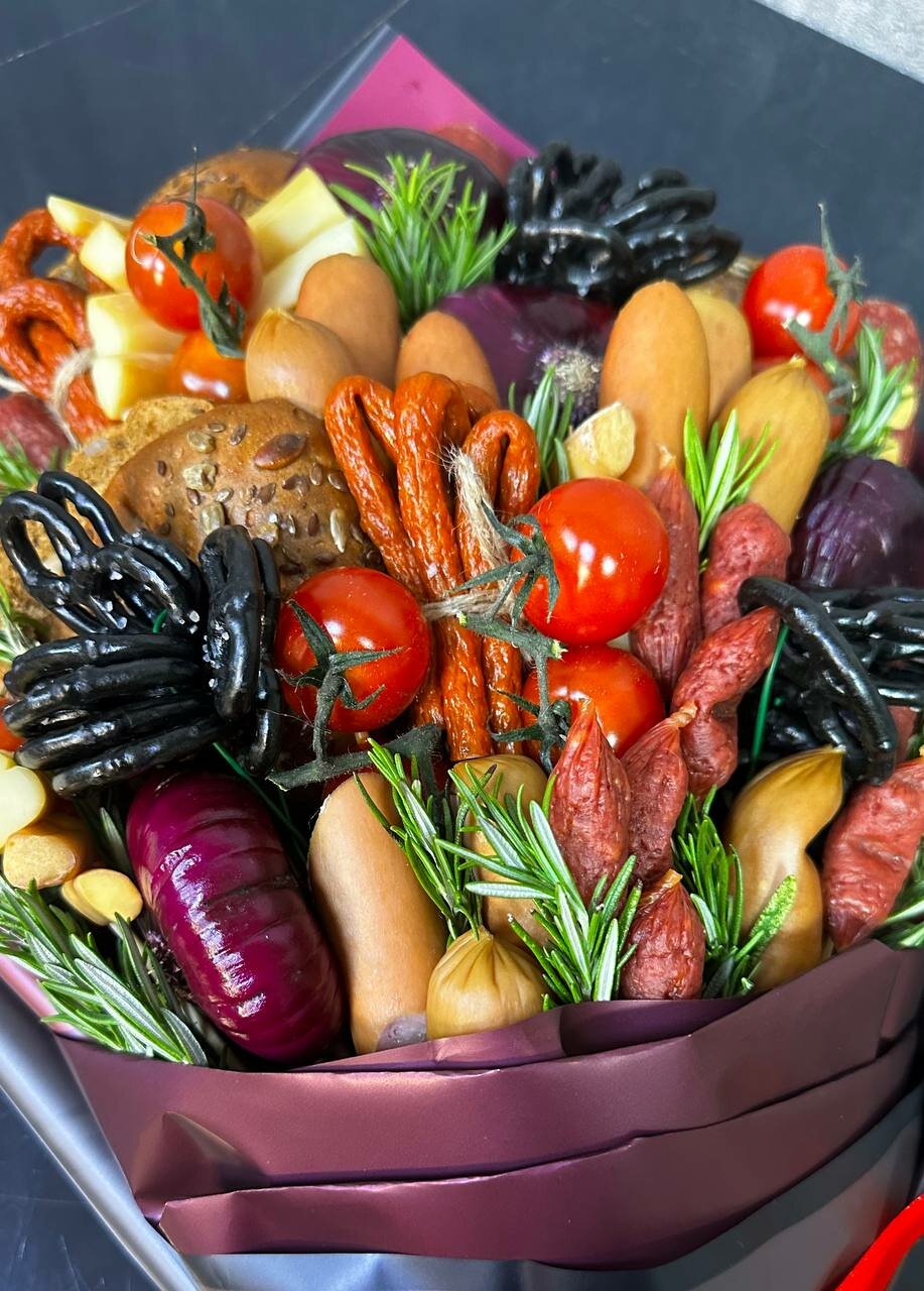 | Состав | Лук, колбаса сырокопчёная, сыр копчёный, колбаски с сыром, кабаноси, пиколини, булочки, розмарин, крендели чёрные |
