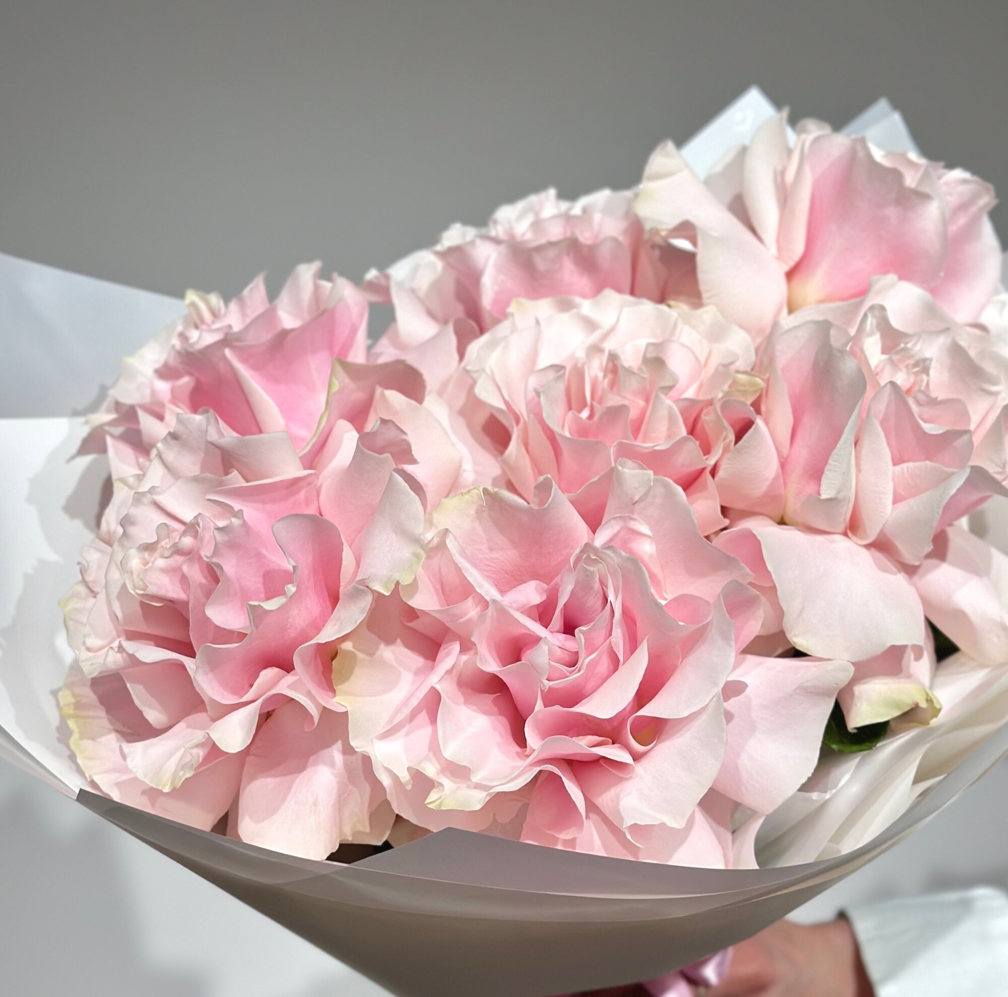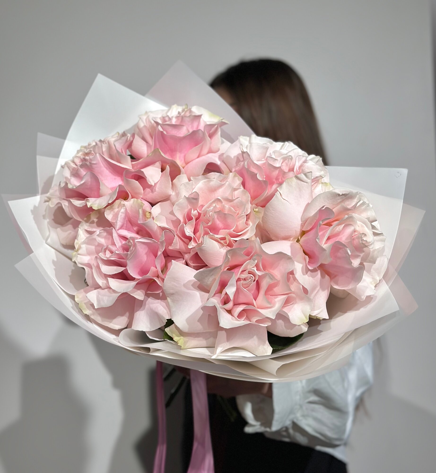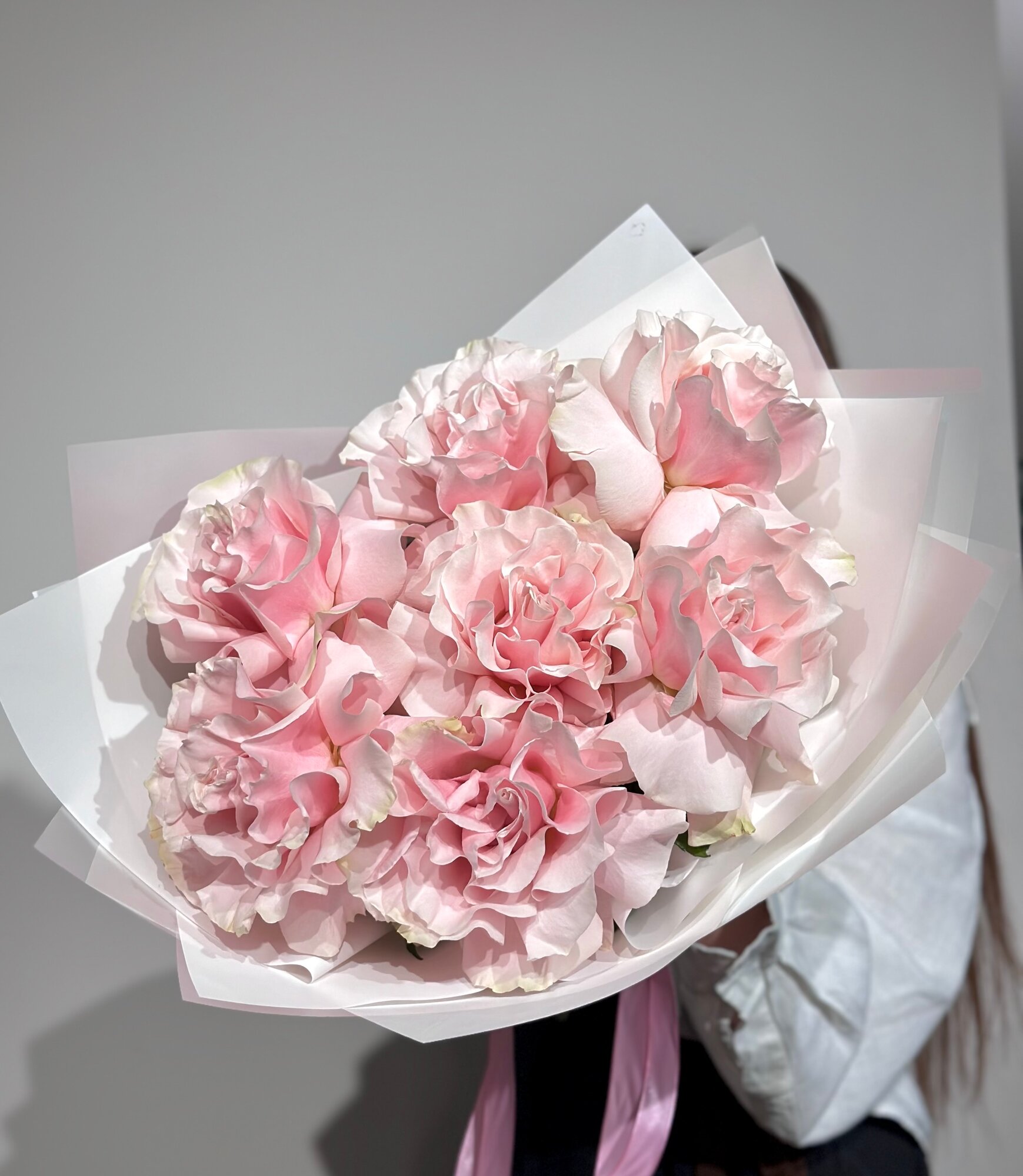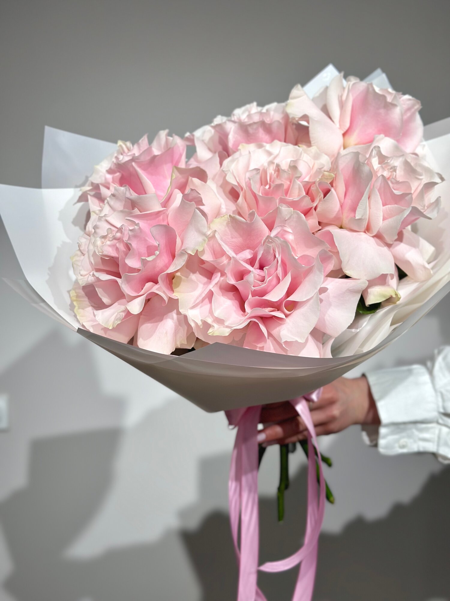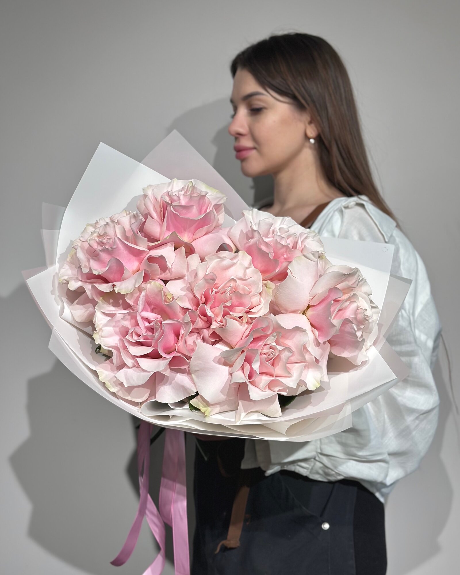 Букет розовых французских роз в стильной упаковке , высота 45 см, размер S букет с доставкой