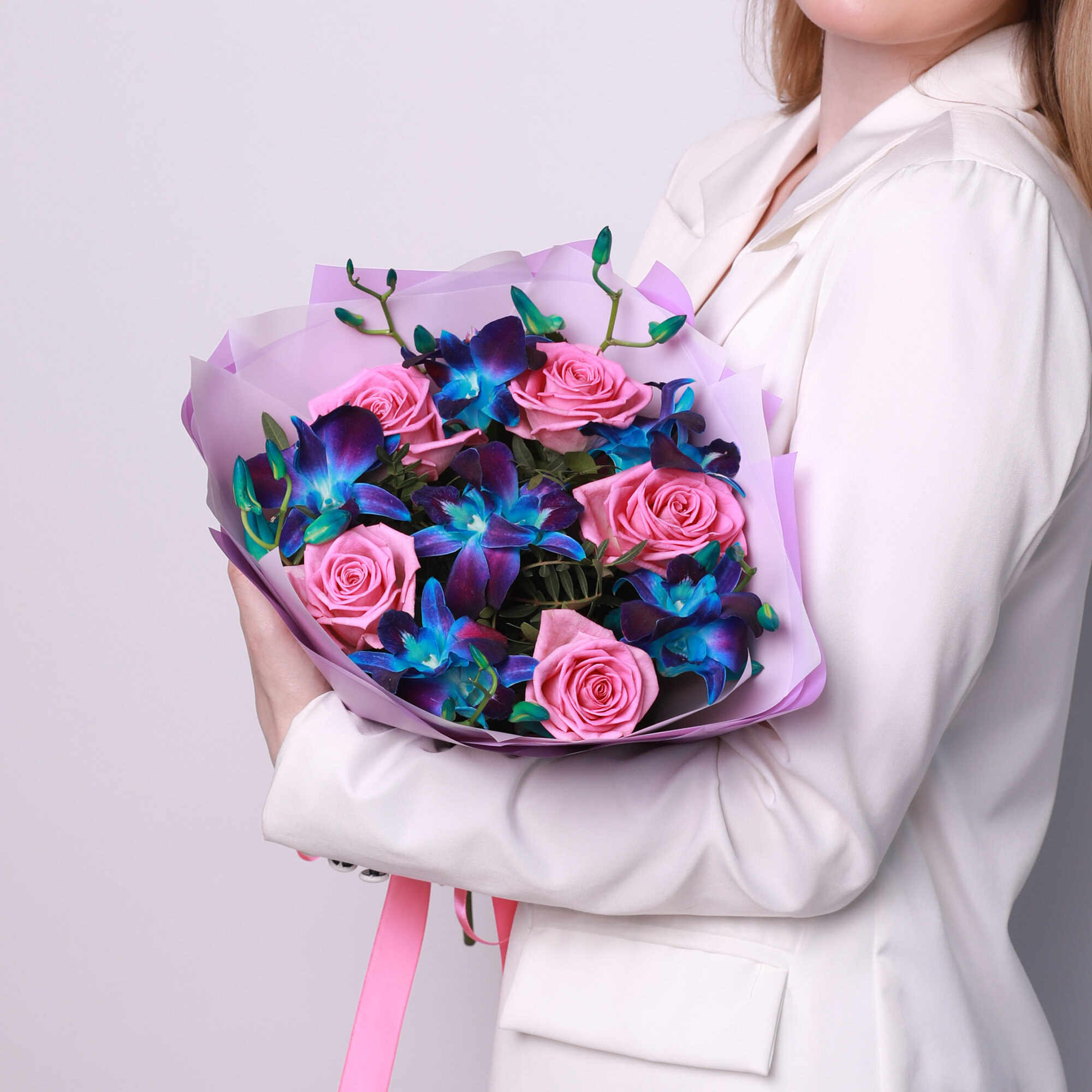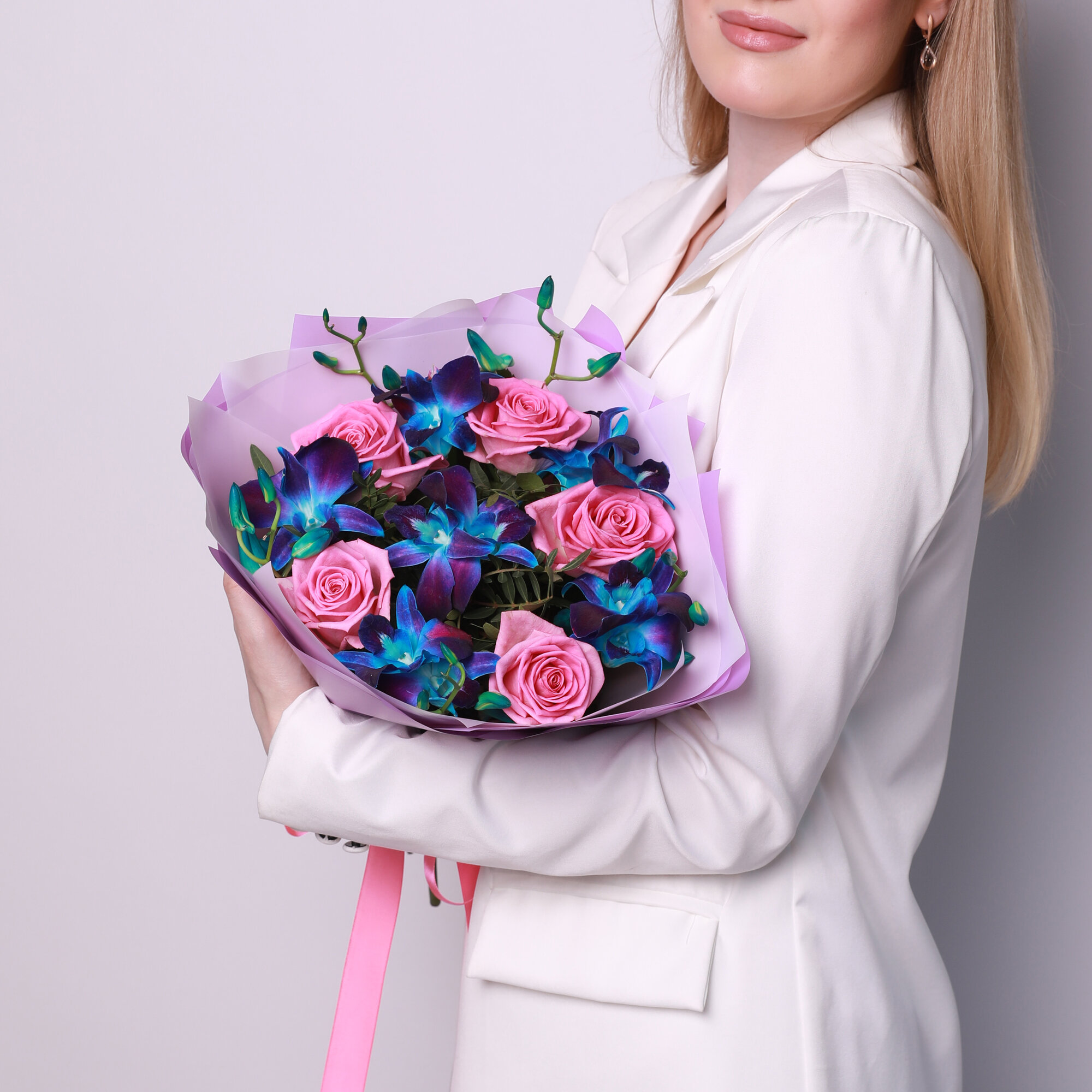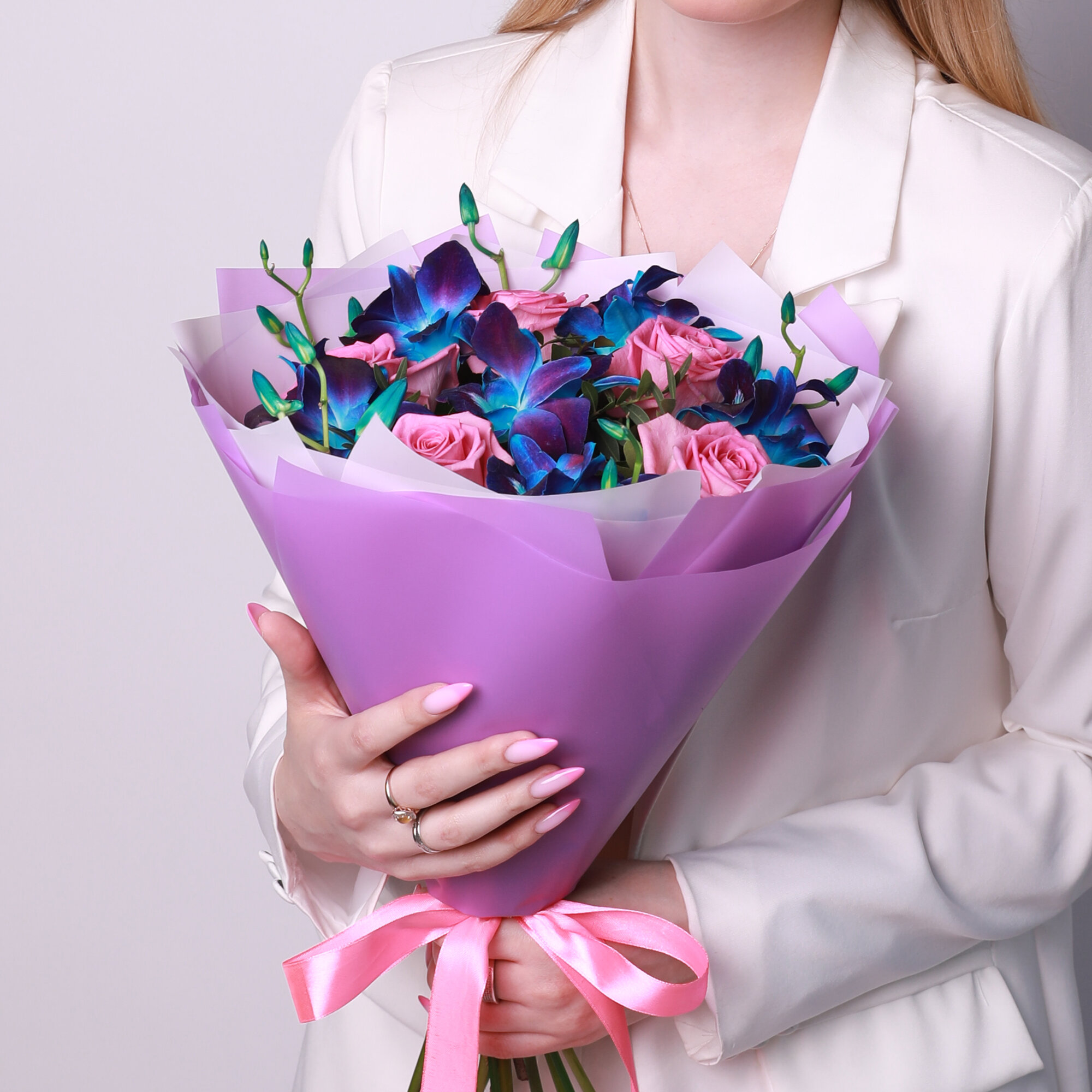 Купить Букет из синих орхидей и розовых роз. Букет 128 ALMOND ROSES