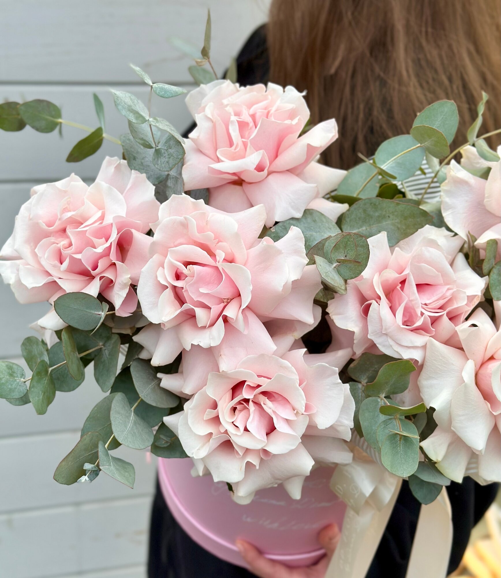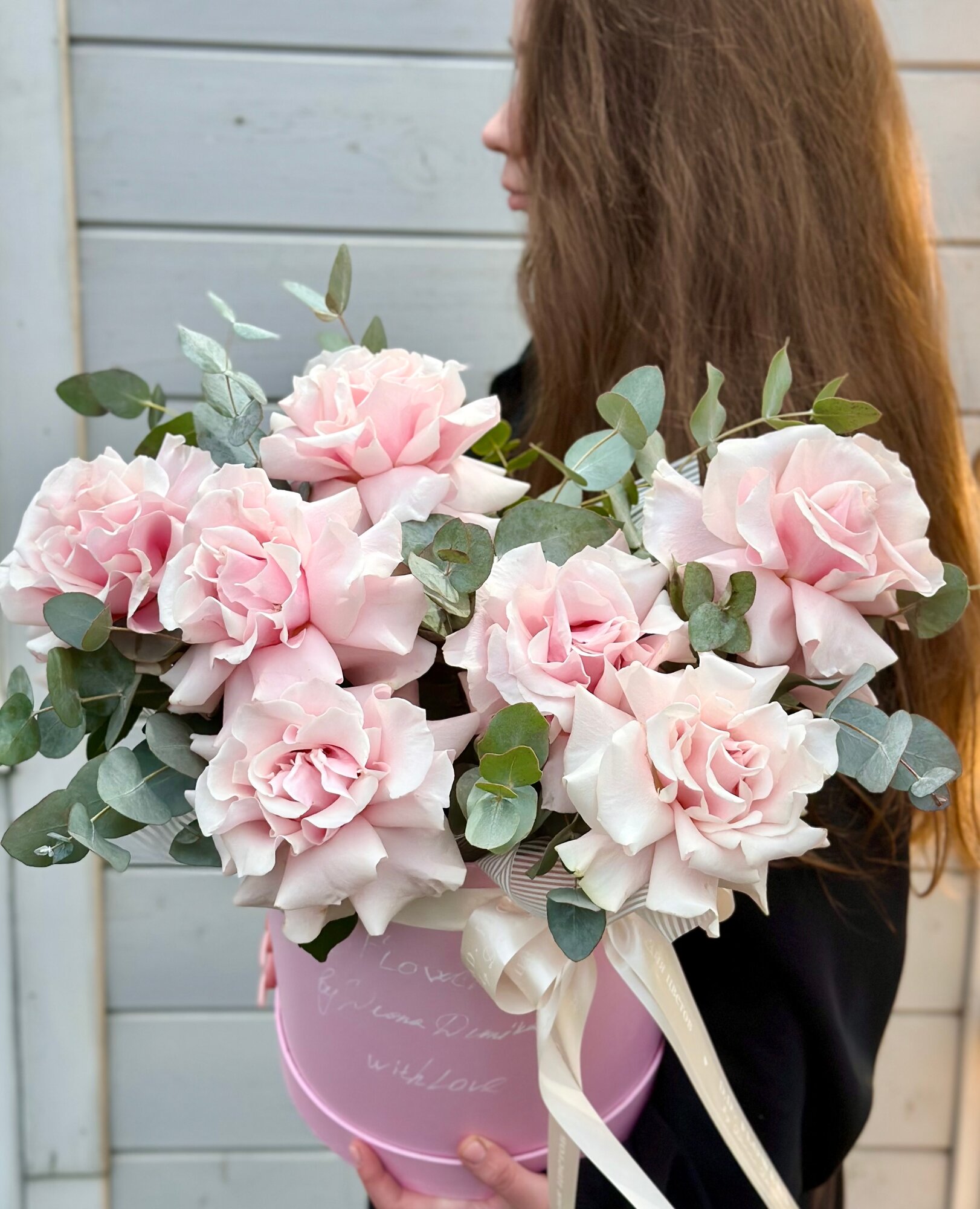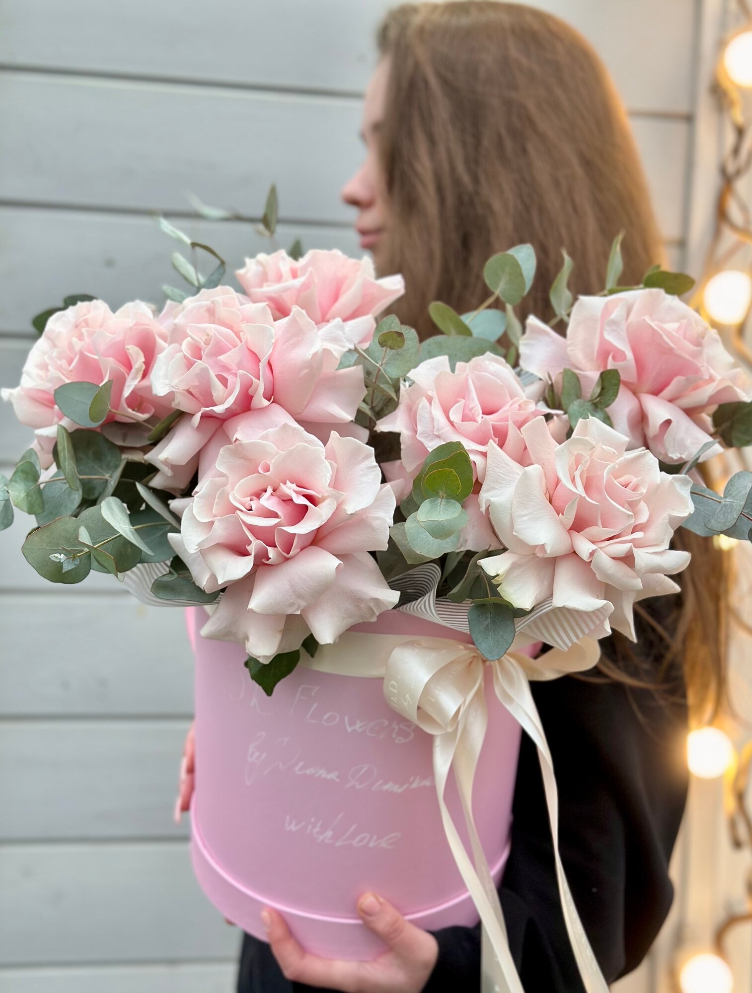 Французские розы розовые с эвкалиптом в шляпной коробке и атласной лентой, композиция розы 7 штук, "S"