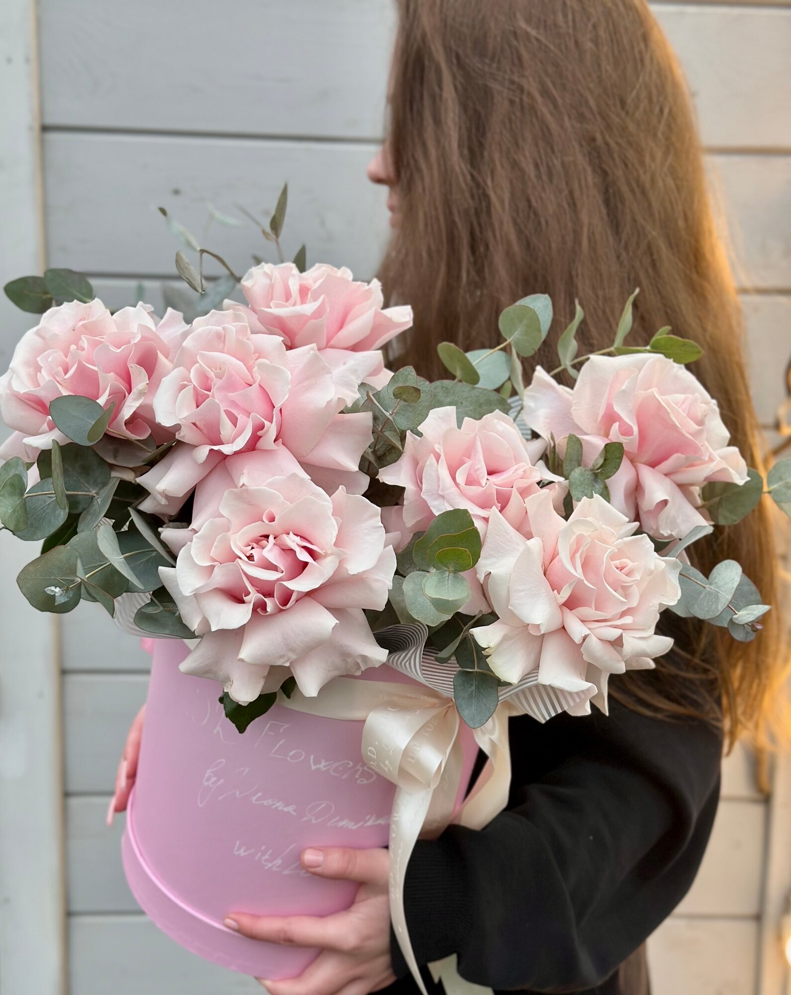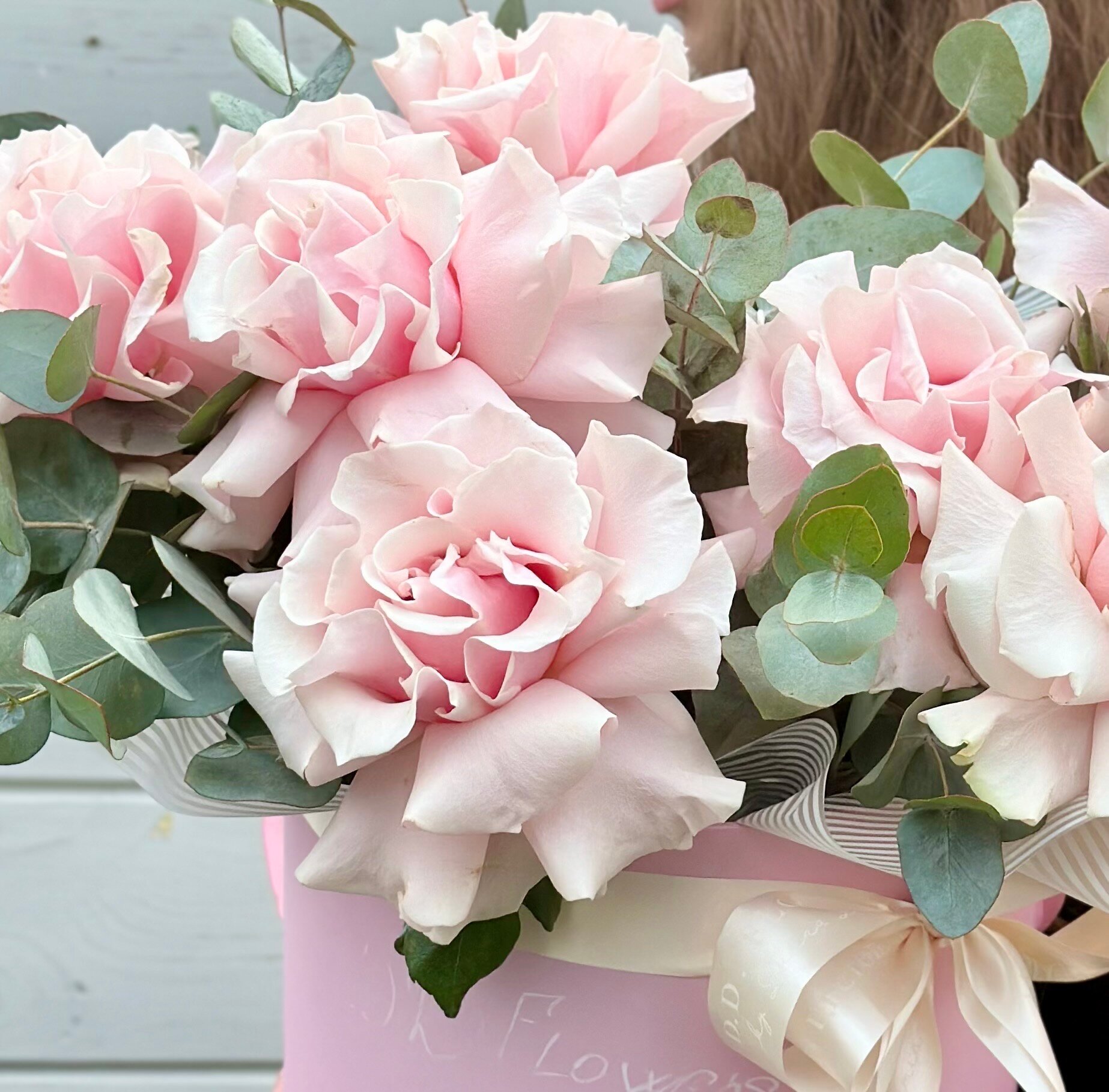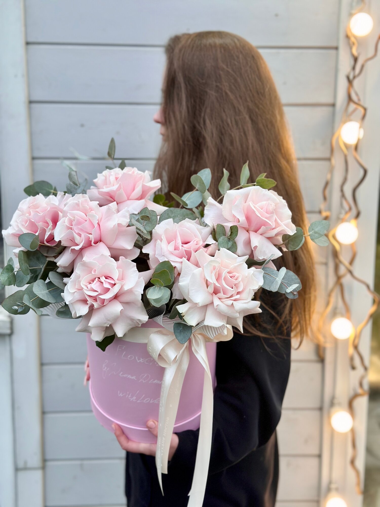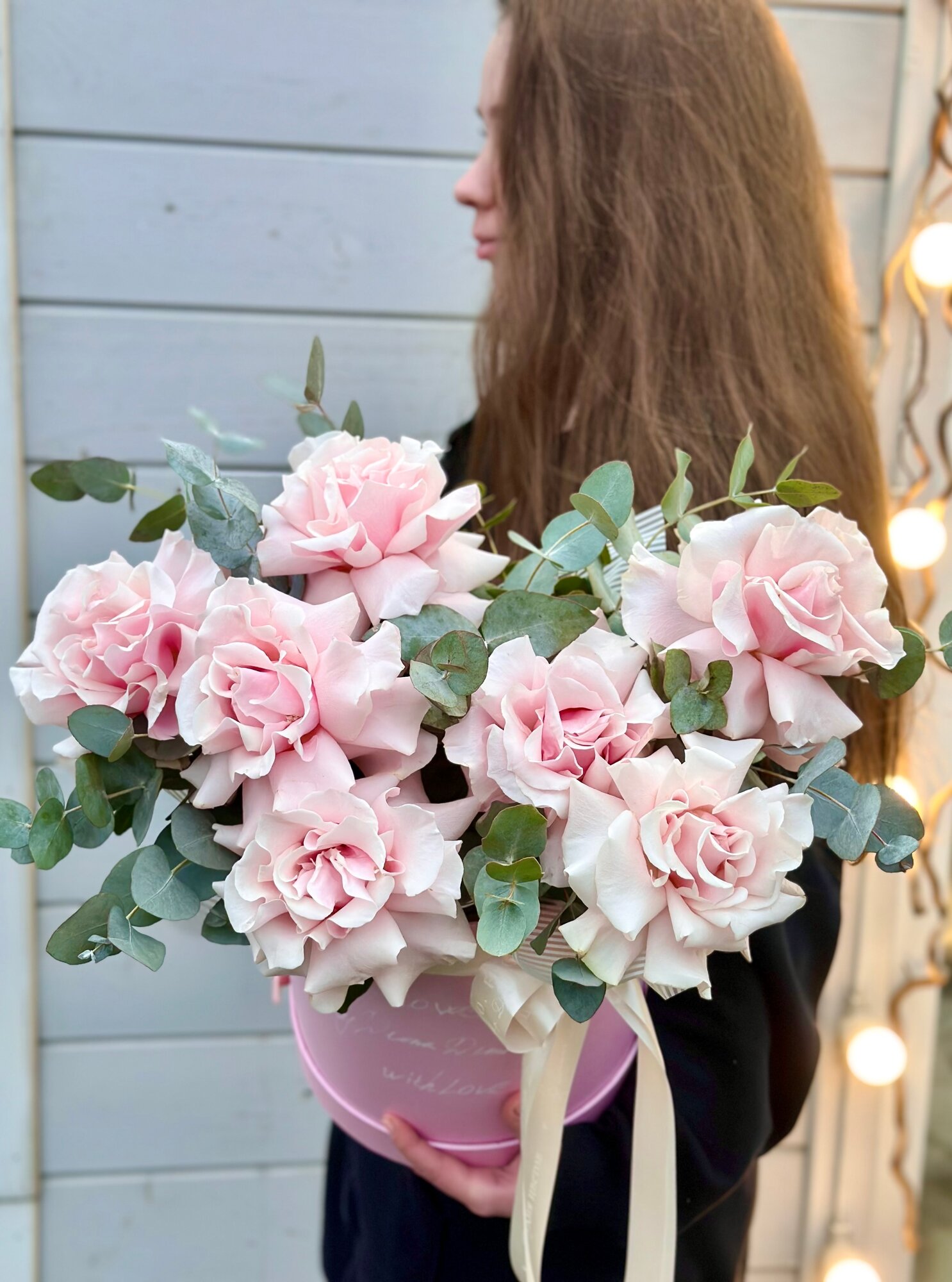 Французские розы розовые с эвкалиптом в шляпной коробке и атласной лентой, композиция розы 7 штук, "S"