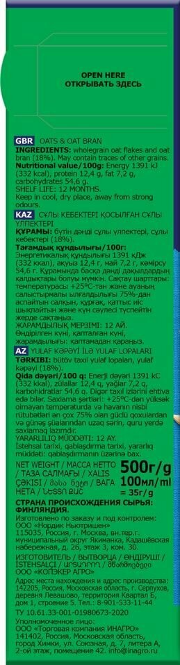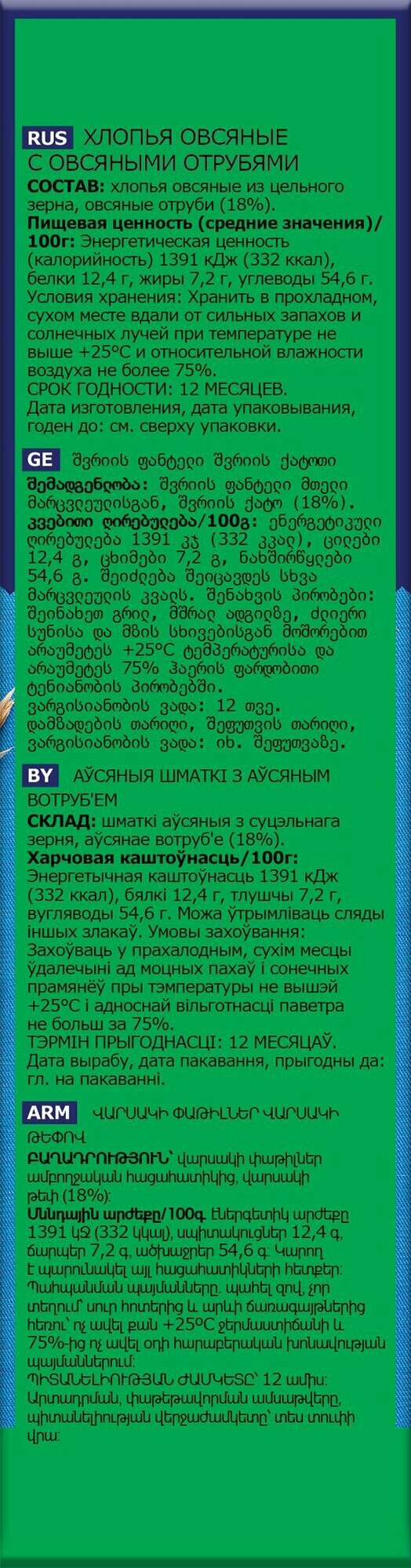 | Состав | хлопья овсяные из цельного зерна, овсяные отруби |
