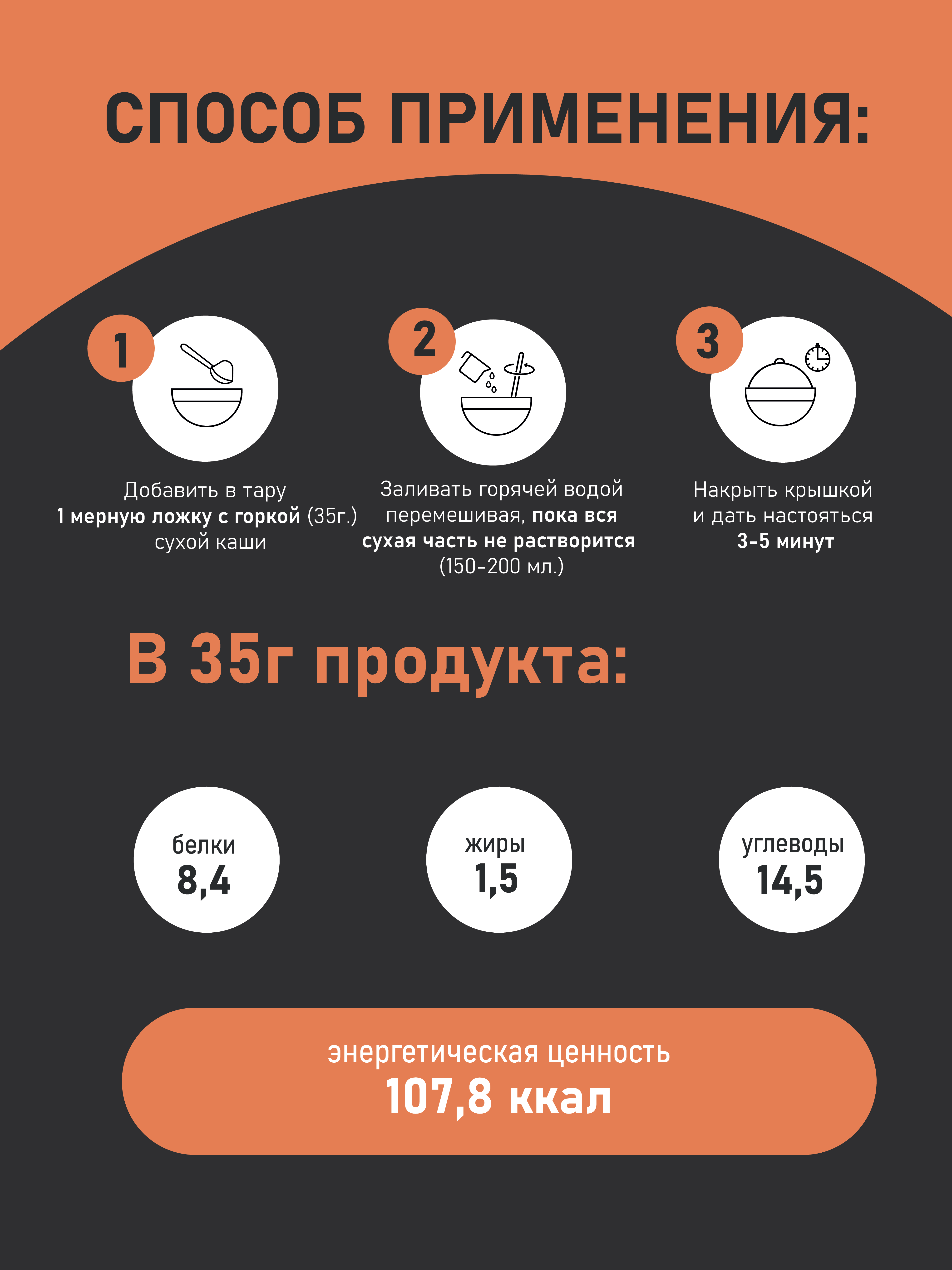 | Способ приготовления | Добавить в тару 1 мерную ложку с горкой (35 гр) сухой каши. Заливать горячей водой/молоком / перемешивая / пока вся сухая часть не растворится (150-200 мл). Накрыть крышкой и дать настояться 3-5 минут. |