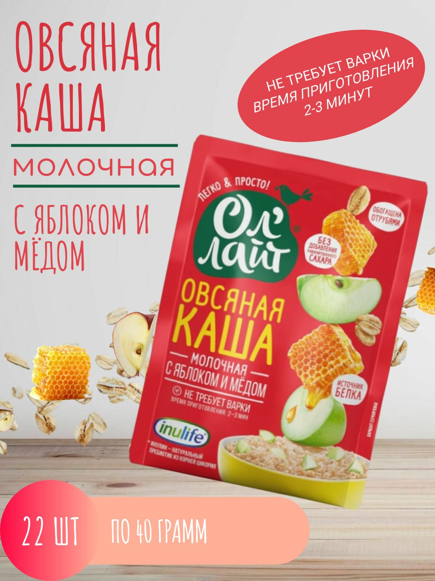 Купить Овсяная каша быстрого приготовления молочная без сахара с яблоком и медом Ол лайт, 22 шт по 40 г