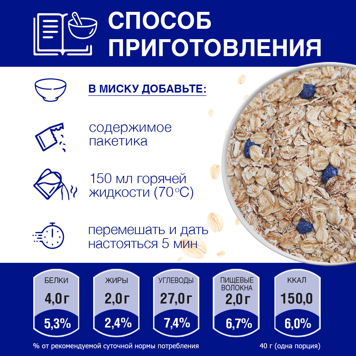 | Состав | хлопья овсяные, сахар, ягоды сушеной черники , соль йодированная, комплекс «Био-Био» (хлопья овсяные, пробиотические лактобактерии Enterococcus faecium L-3), ароматизатор ванилин |