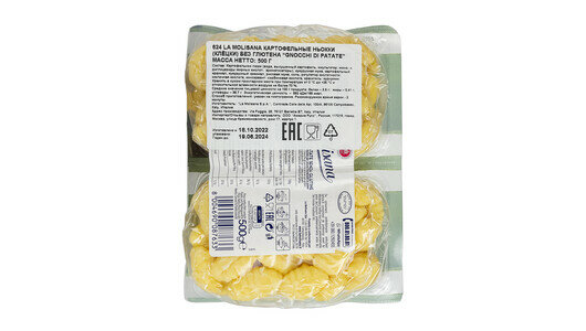 | Состав | картофельное пюре 80% (вода, высушенный картофель: красный картофель, эмульгаторы: моно - и диглицериды жирных кислот; антиокислитель: пиросульфит натрия; натуральные ароматизаторы), пшеничная мука тип «00», картофельный крахмал, рисовая мука, соль, регулятор кислотности: молочная кислота, антиокислитель: аскорбиновая кислота; ароматизаторы |