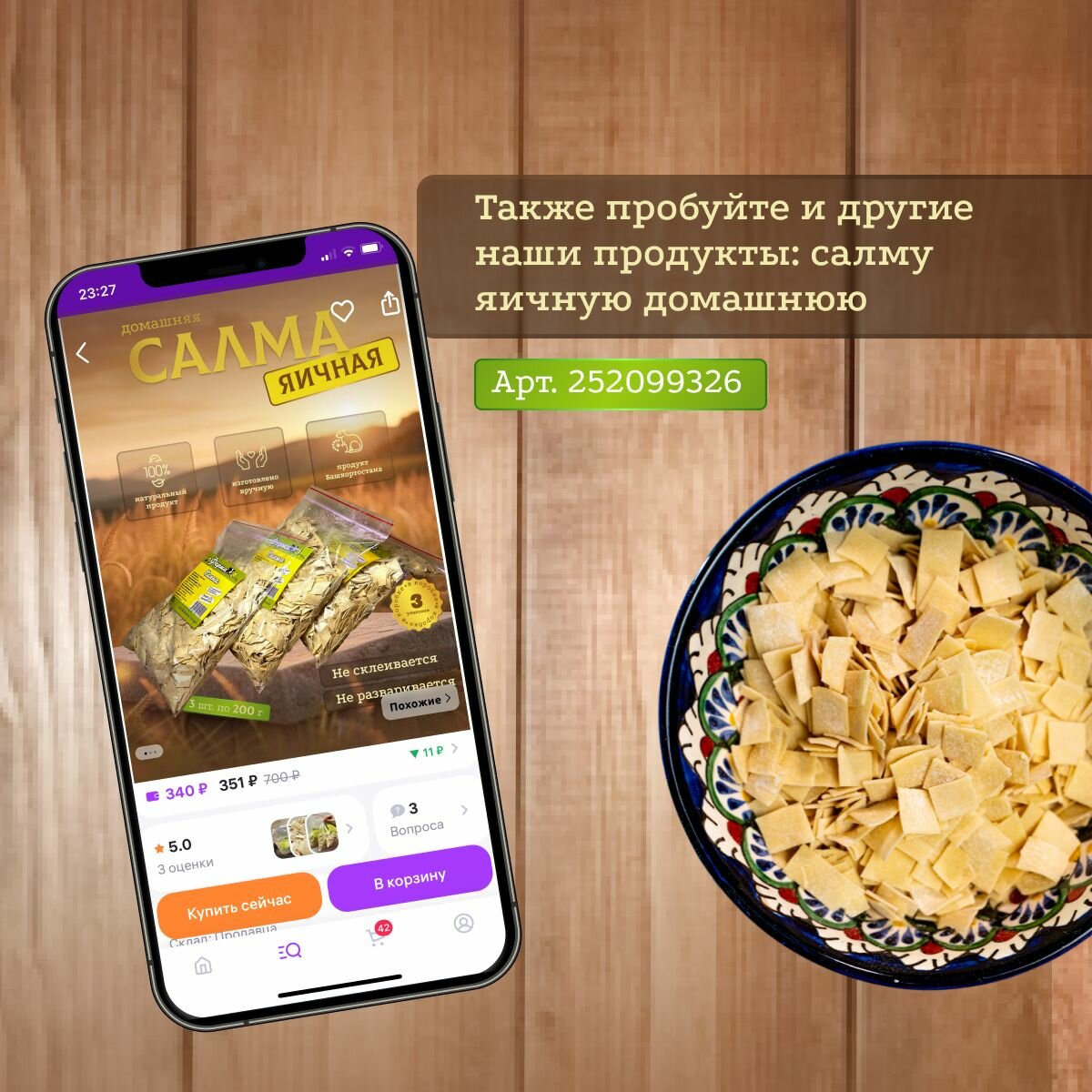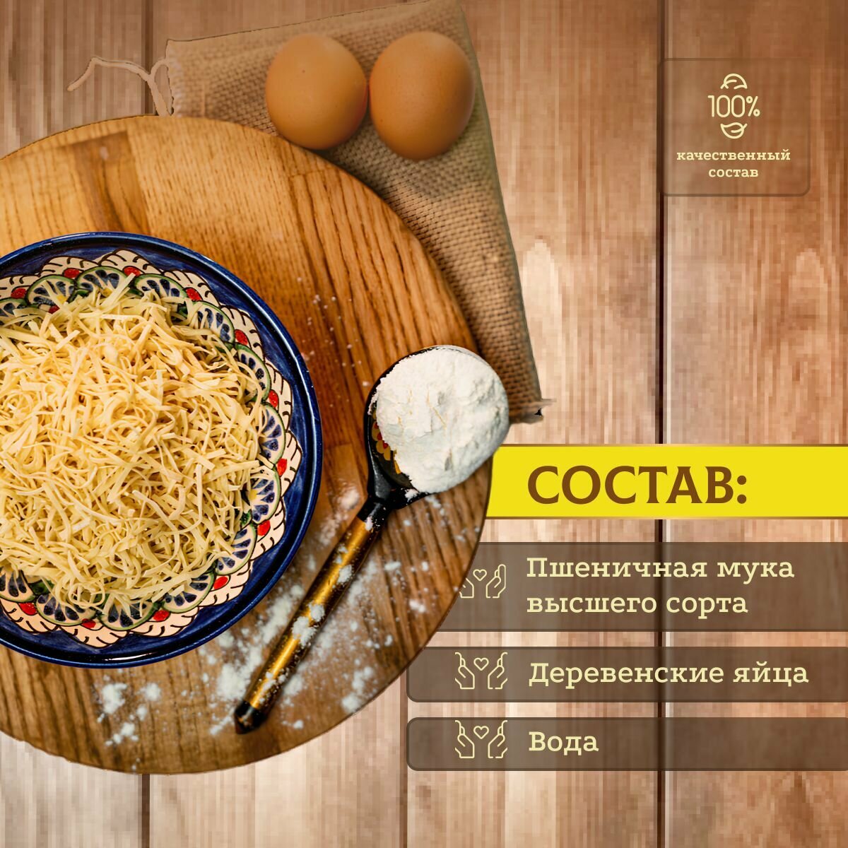 | Стандарты производства | Лапша изготовлена посредством ручной лепки, в составе только натуральные продукты: мука пшеничная, яйца, вода, соль. |
