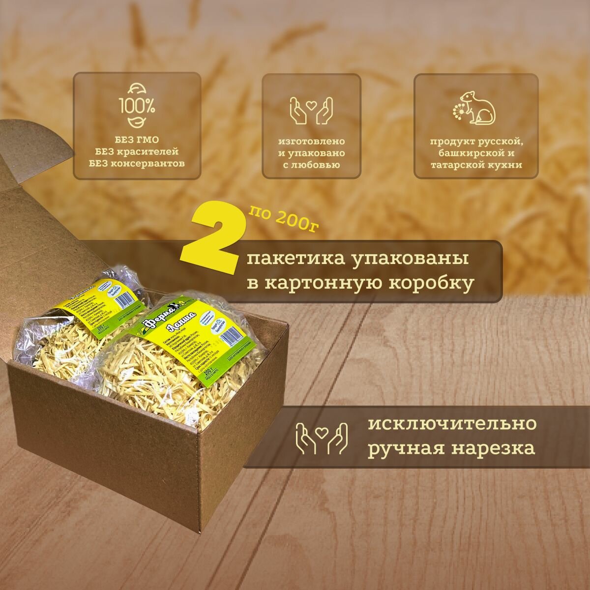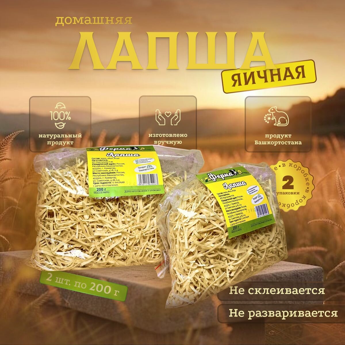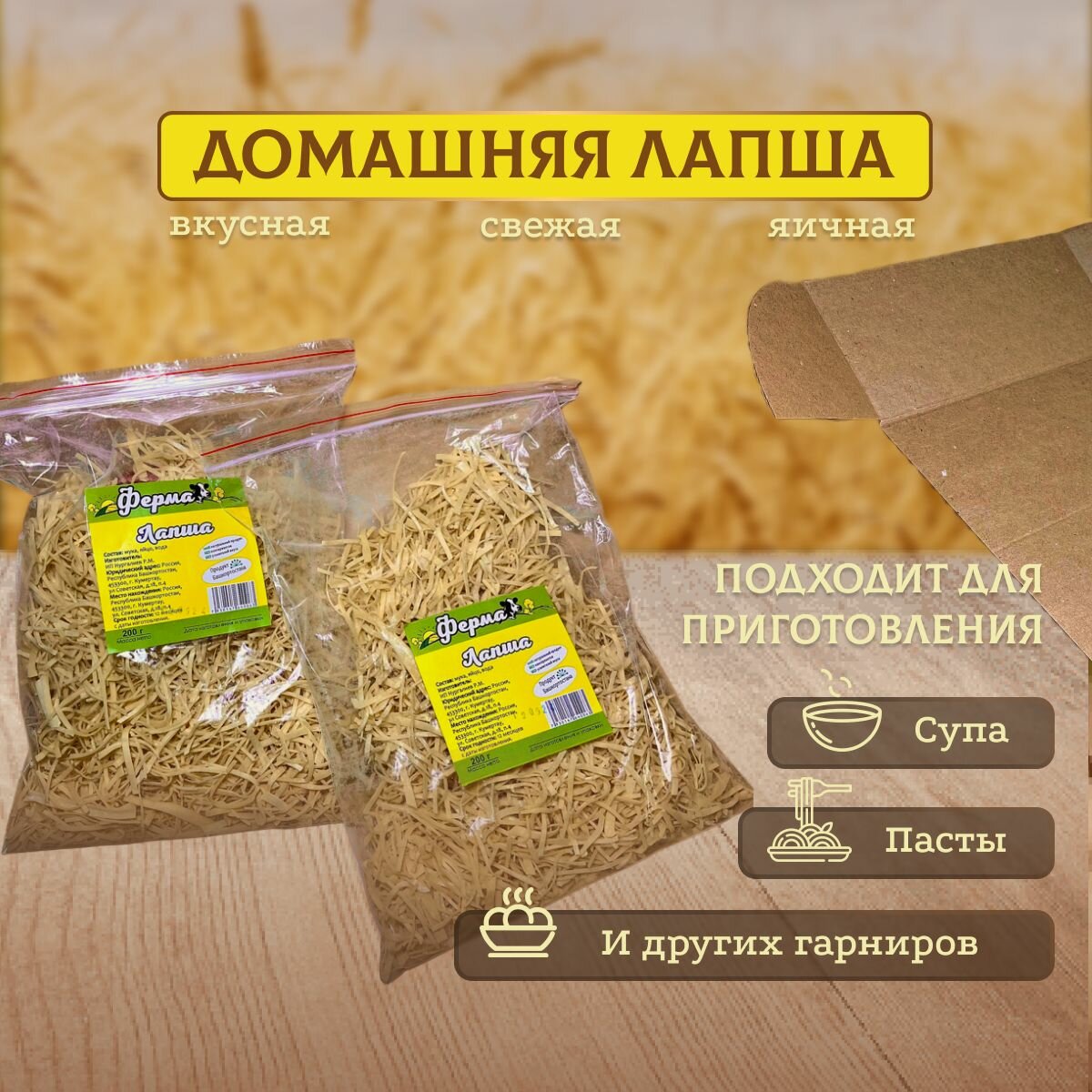 | Дополнительная информация | доставка осуществляется в картонной коробочке, в которой находятся два зиппакета с лапшой по 200г |