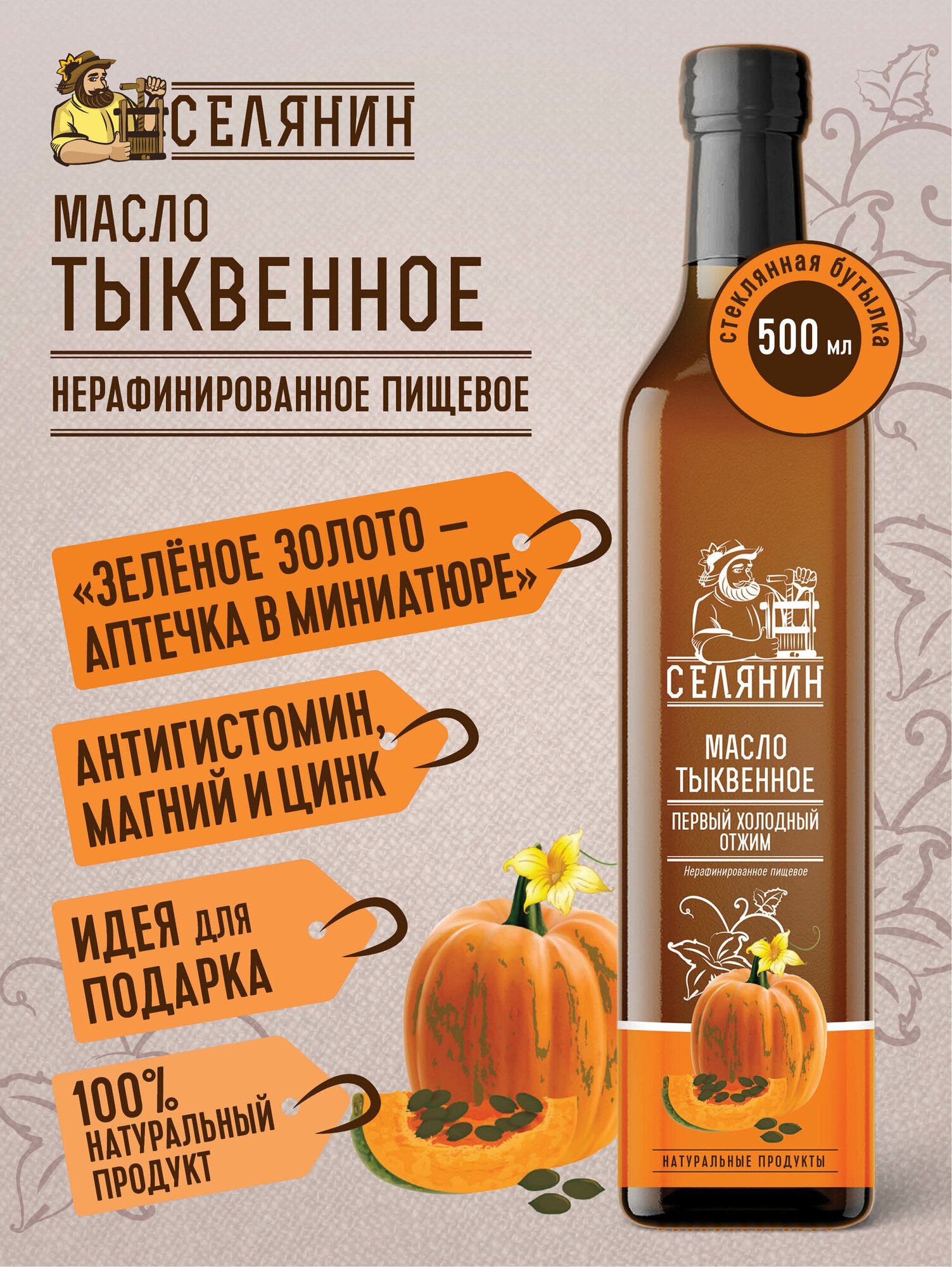 Масло тыквенное, нерафинированное, холодного отжима, натуральное, пищевое, 500мл., стекло интересное: