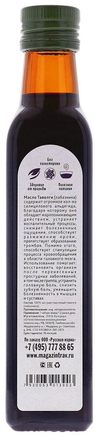 | Дополнительная информация | Масло лабазника (таволги) используют различными способами:Внутреннее применение. Рекомендуется принимать по 1 ч. л. во время еды 1 раз в день. При любых заболеваниях рекомендуется принимать на протяжении 1 месяца.Наружное использование. При устойчивых болях используют для компрессов. При ангине и прочих бактериальных заболеваниях используют для полоскания ротовой полости.Ванны, ароматерапия. При бессоннице, возбуждении нервной системе, подверженности стрессу добавляют в ванны для купания, используют для проведения массажа, в качестве средства для ароматерапии. |
