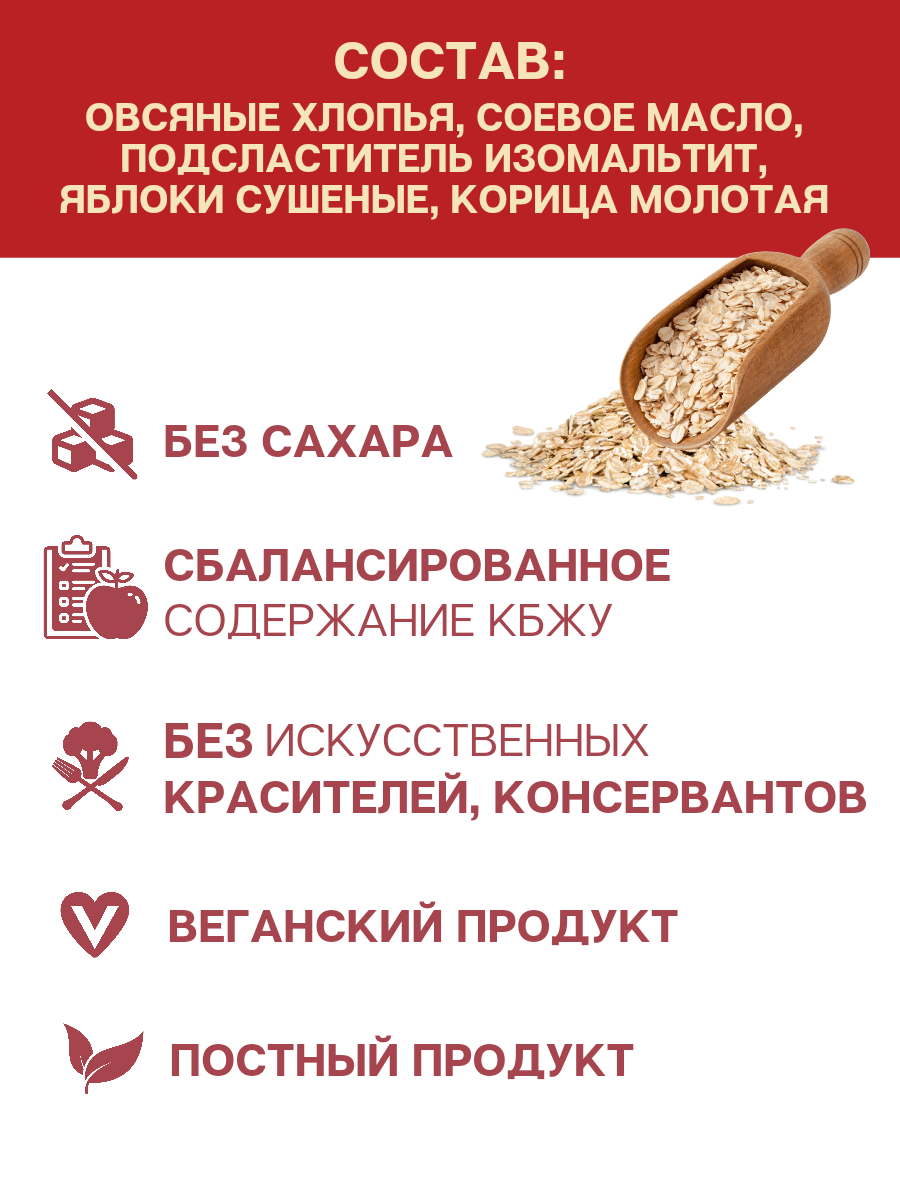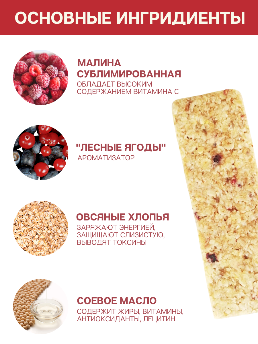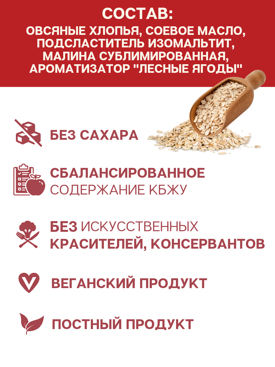 | Состав | овсяные хлопья, подсластитель изомальтит, соевое масло, малина сублимированная, ароматизатор «Лесные ягоды». Содержит подсластитель. При чрезмерном потреблении может оказывать слабительное действие. |