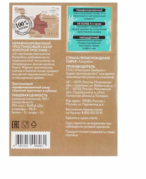 Сахар «Мистраль» Золотой тростник тростниковый нерафинированный в кубиках, 400 г 2 коробочки интересное: