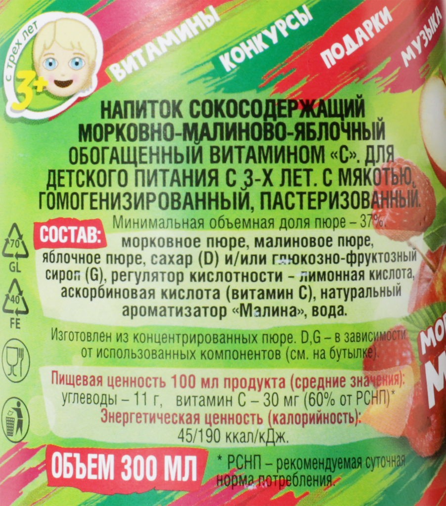 | Состав | морковное пюре, малиновое пюре, яблочное пюре, сахар, глюкозно-фруктозный сироп, фруктоза, регулятор кислотности - лимонная кислота, аскорбиновая кислота (витамин С), ароматизатор идентичный натуральному "Малина", вода |