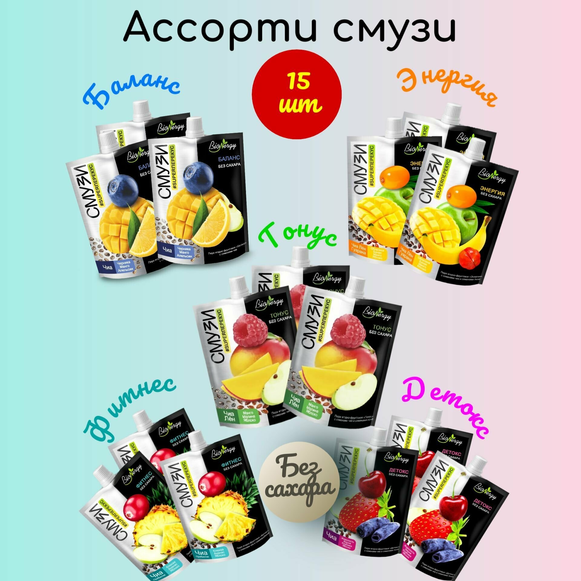 Купить Смузи Ассорти набор микс без сахара 15 шт по 120 мл Детокс, Фитнес, Энергия, Баланс, Тонус