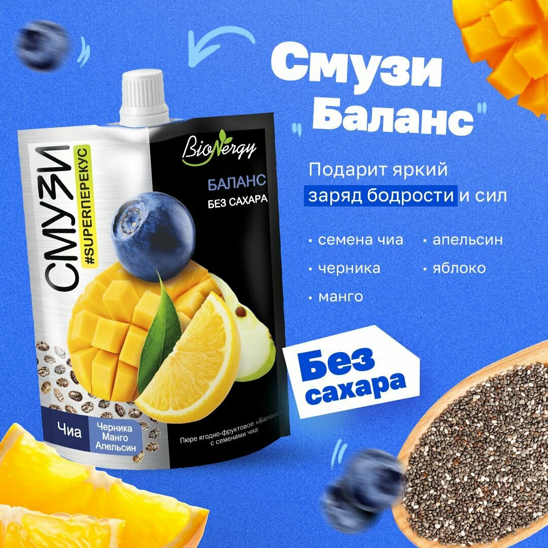 Ассорти смузи ягодно-фруктовые BioNergy с семенами чиа, 5 вкусов