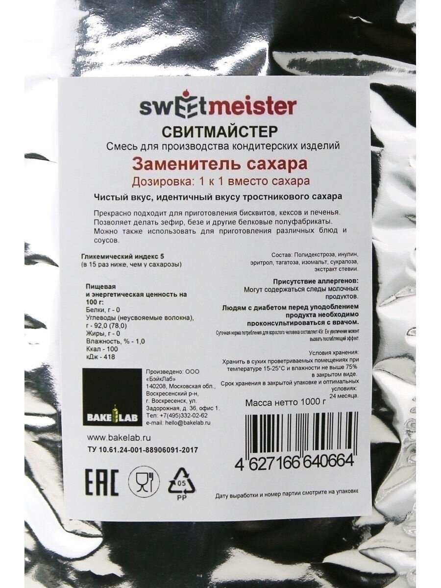 Сахарозаменитель "Sweetmeister" (Свитмайстер) для выпечки и десертов, 1 кг. интересное: