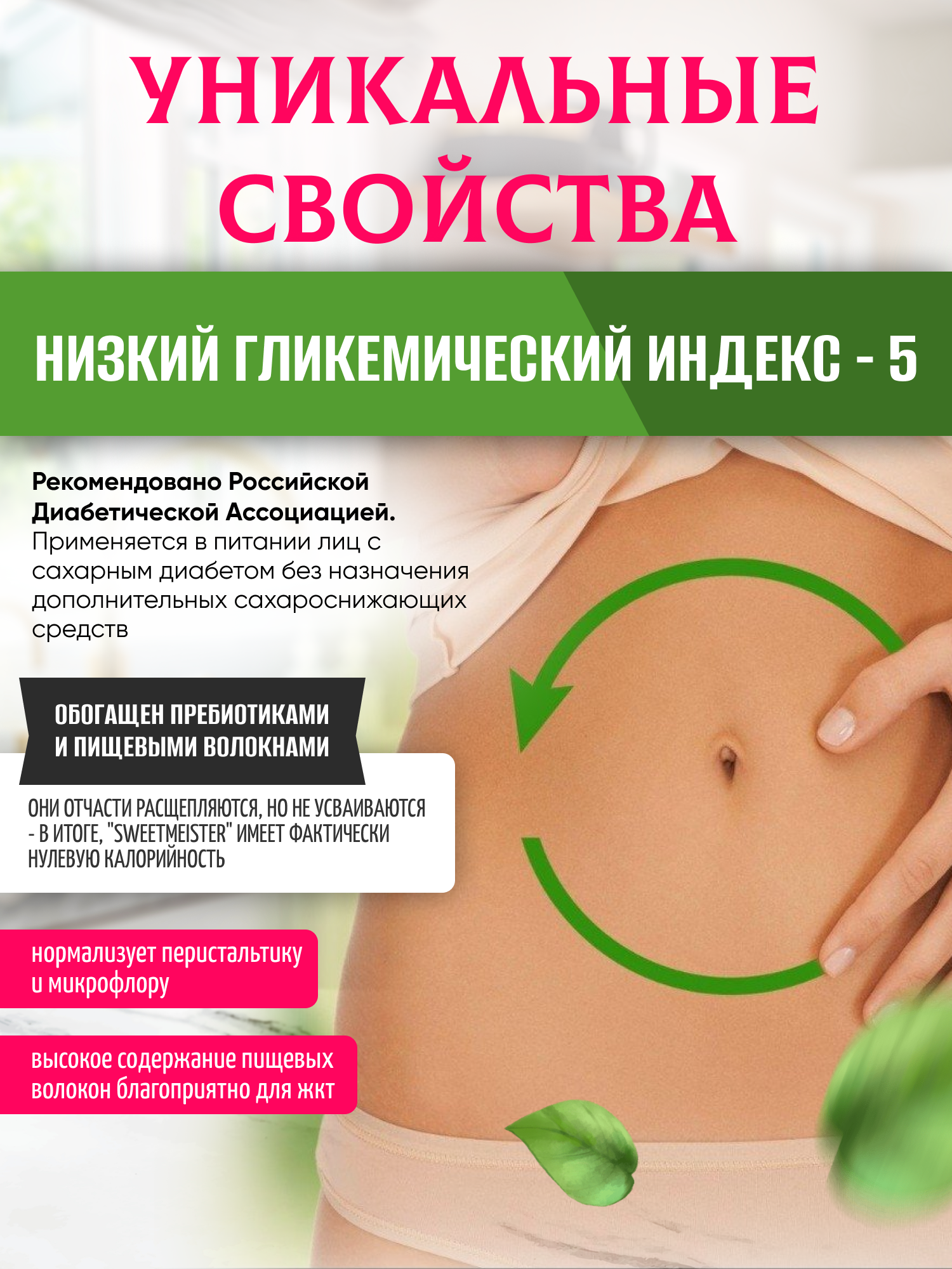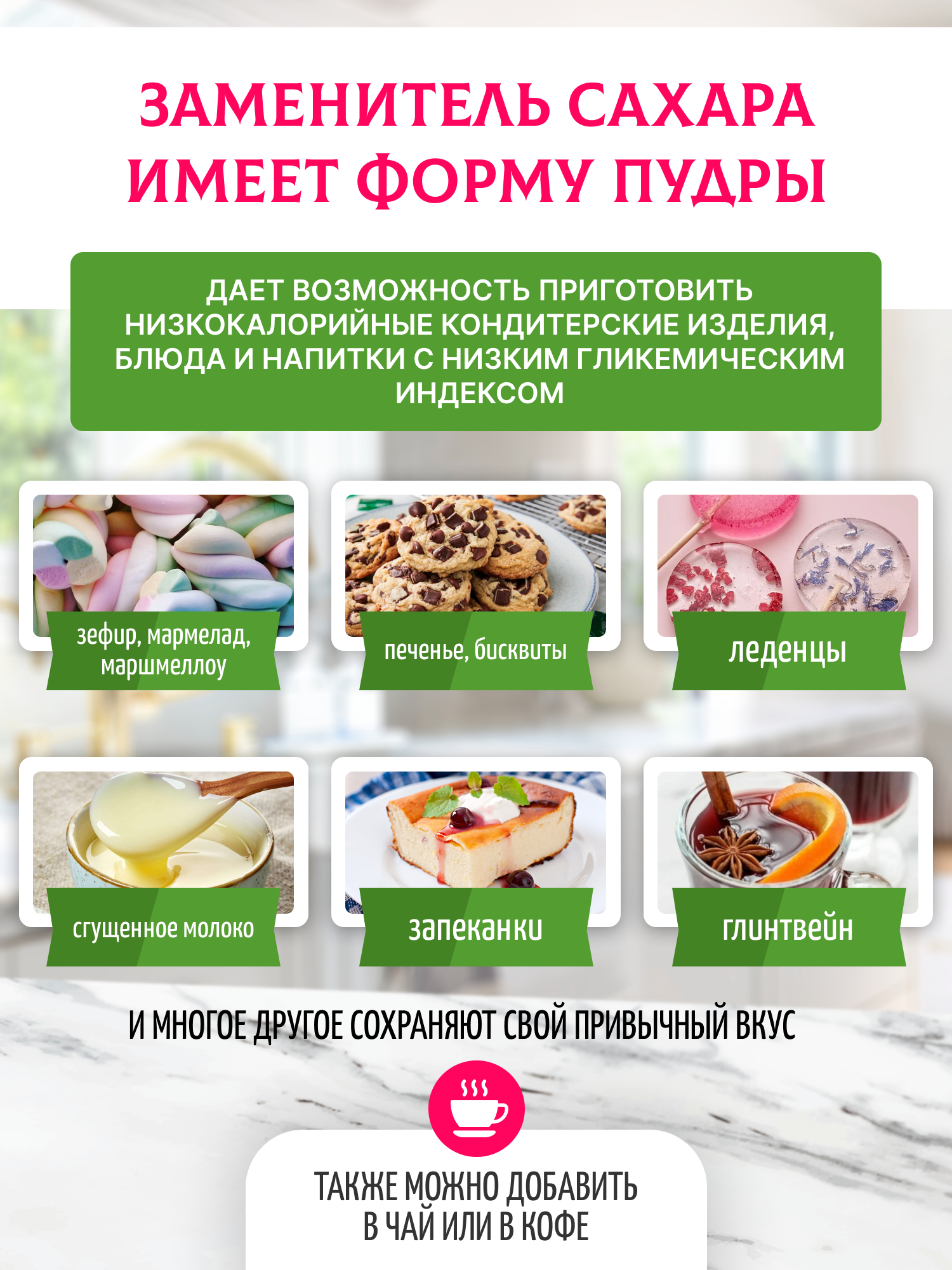 | Дополнительная информация | подходит для различных диет, низкий гликемический индекс = 5, чистый сладкий вкус, без привкуса, термостабильный, позволяет приготовить торты, булочки, зефир, мармелад, маршмеллоу, бисквиты, печенье, каши, сгущенное молоко, запеканки, глинтвейн, напитки, еда, конфеты, леденцы, лепешки, хлебные изделия, хлеб, выпечка, чай, кофе, компот, лимонад, морс, сгущенка, сладости, бисквит |