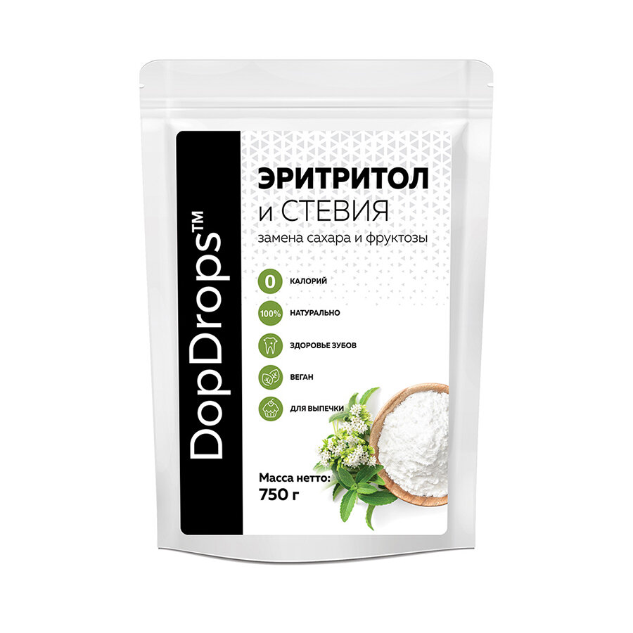 Купить Натуральный сахарозаменитель DopDrops Эритритол (Эритрит) со стевией, идентичен сладости сахара, 750 г