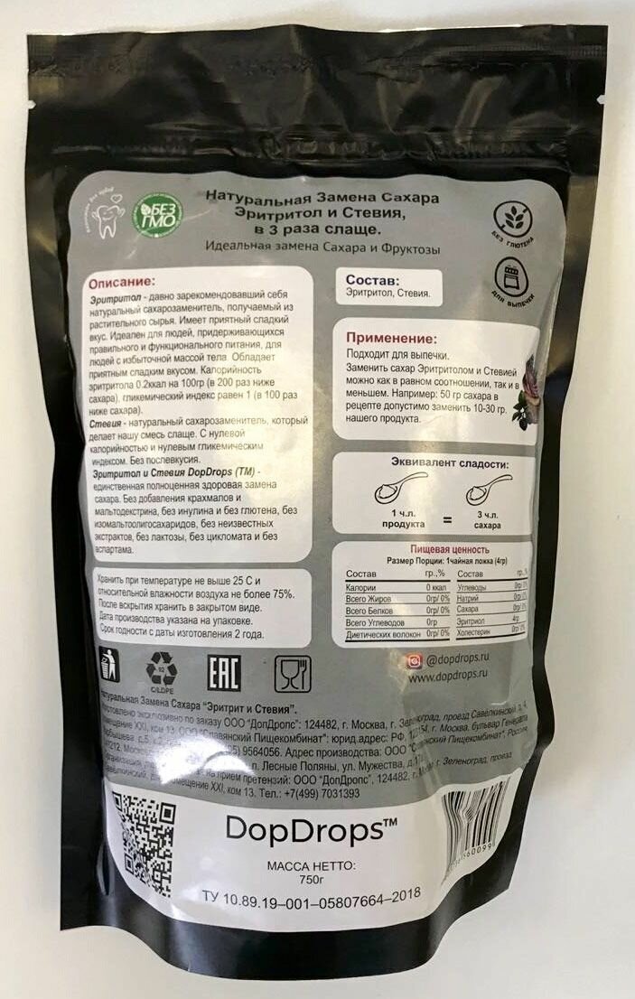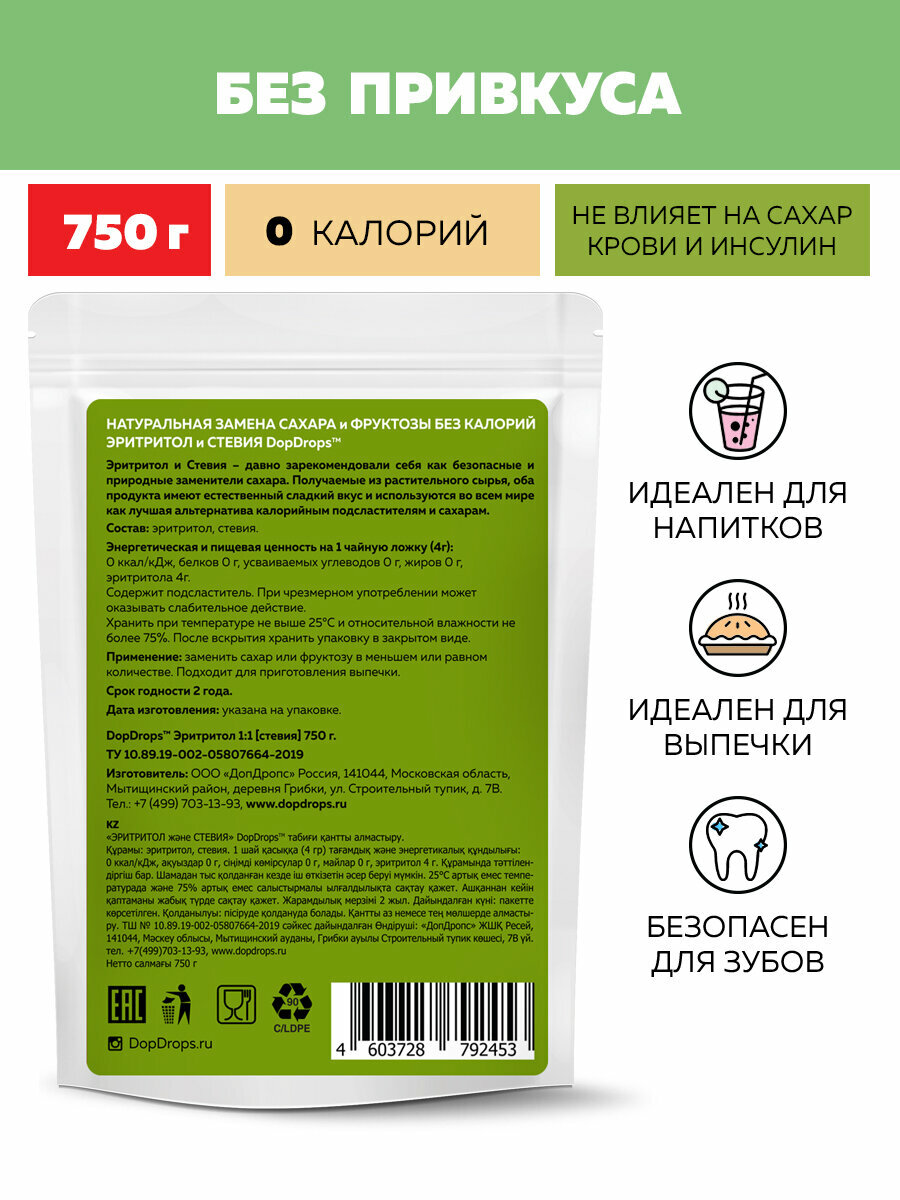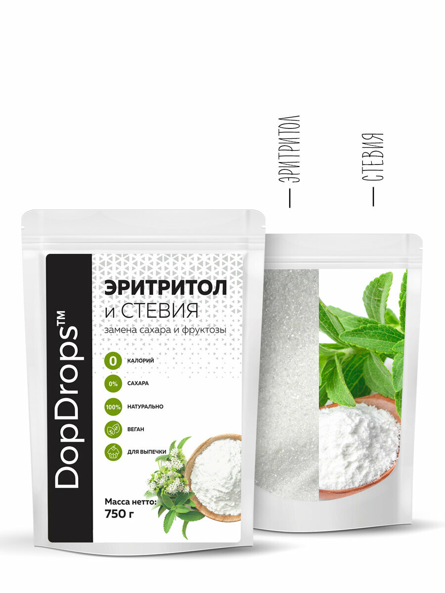 Натуральный сахарозаменитель DopDrops Эритритол (Эритрит) со стевией, идентичен сладости сахара, 750 г интересное: