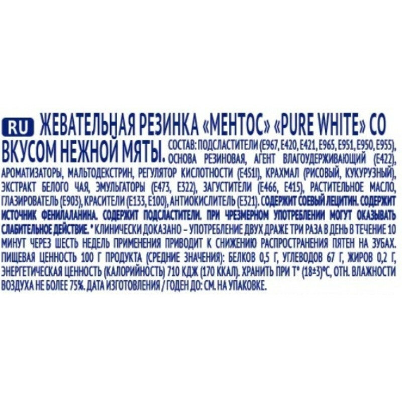 Купить Жевательная резинка MENTOS Pure White Нежная мята, 100шт.*2г