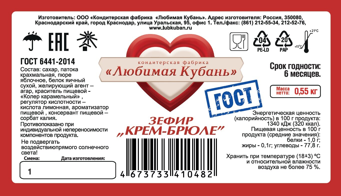 Зефир Крем-Брюле на агаре 550 г, Любимая Кубань ГОСТ интересное: