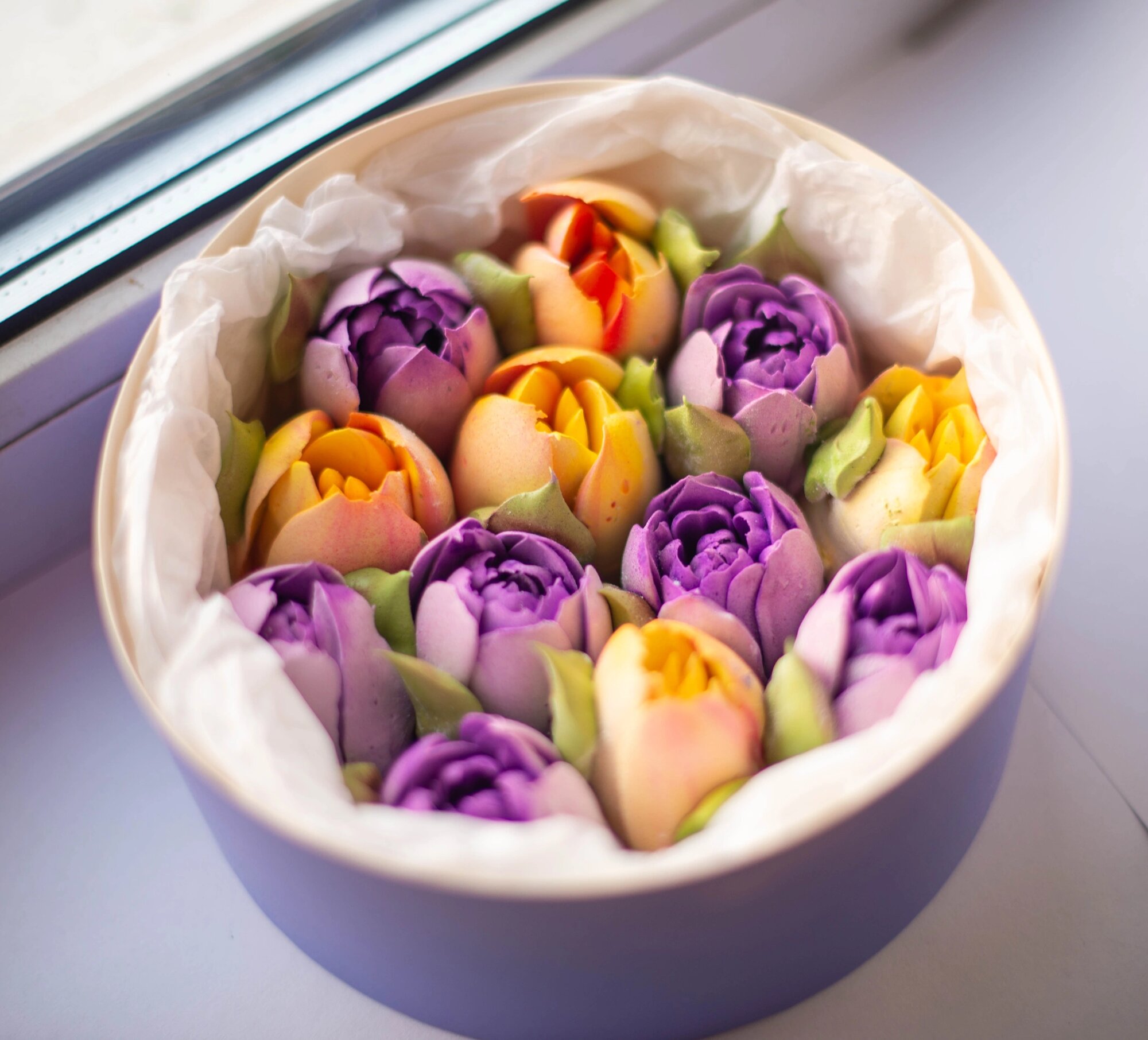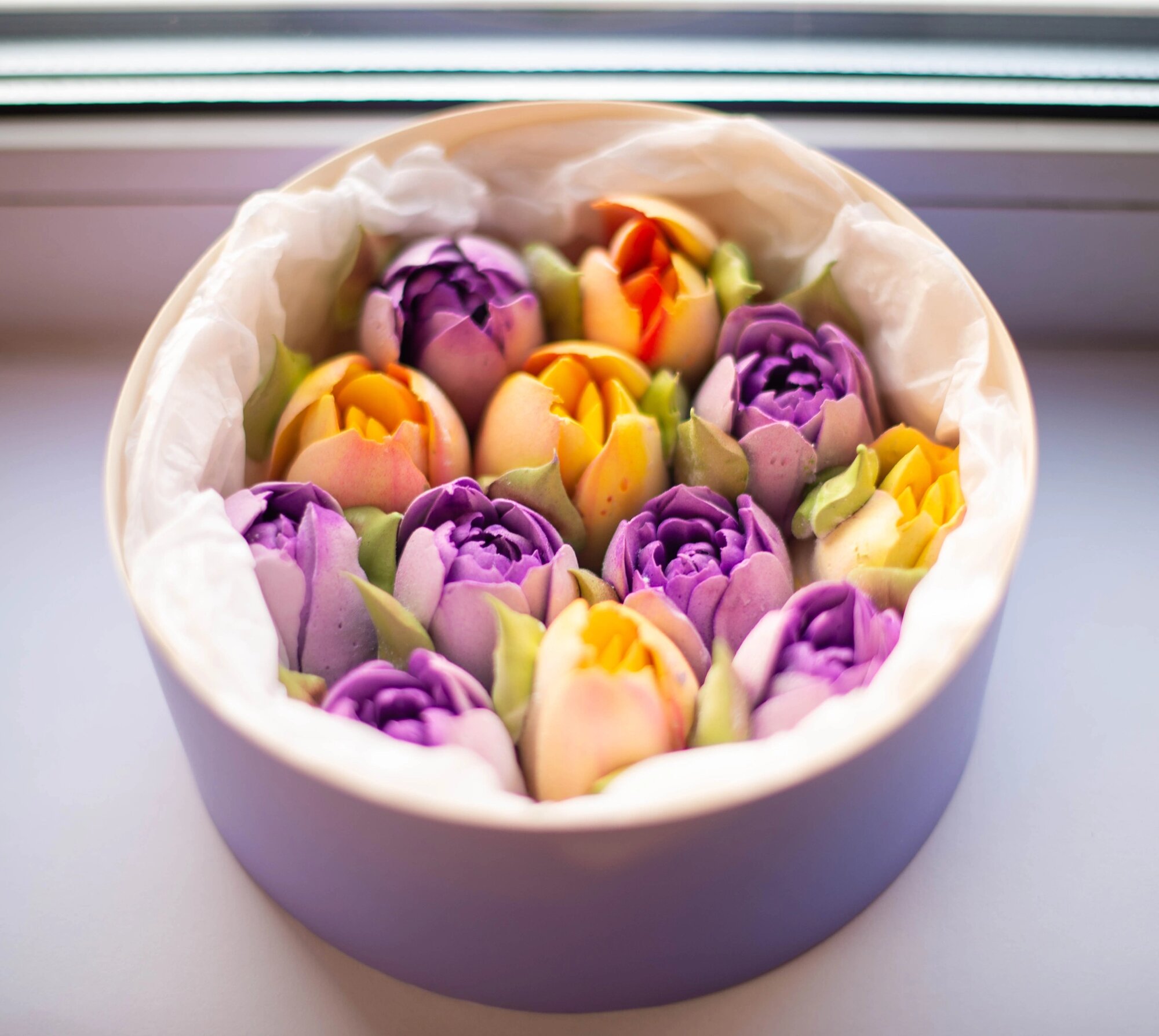Зефир ручной работы. Зефирные тюльпаны в подарочной коробке, диаметр 16 см. интересное: