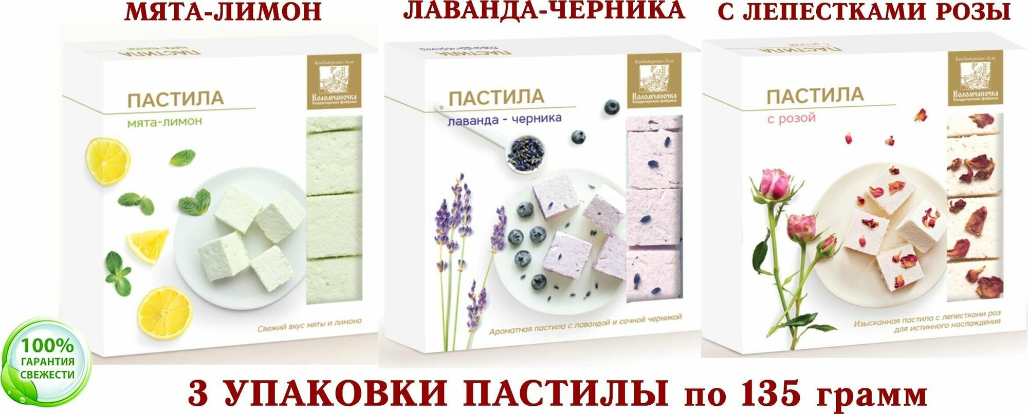 Купить Пастила ассорти мята-лимон/лаванда-черника/С лепестками розы "Коломчаночка" (Коломна) 3 упаковки по 135 гр.