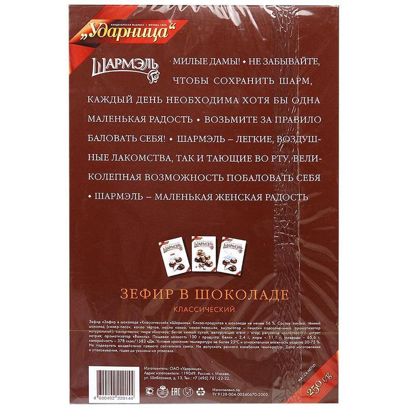 Зефир шармэль в шоколаде, с классическим вкусом, 250 г, картонная коробка, 1050201103, 1шт. в компл интересное: