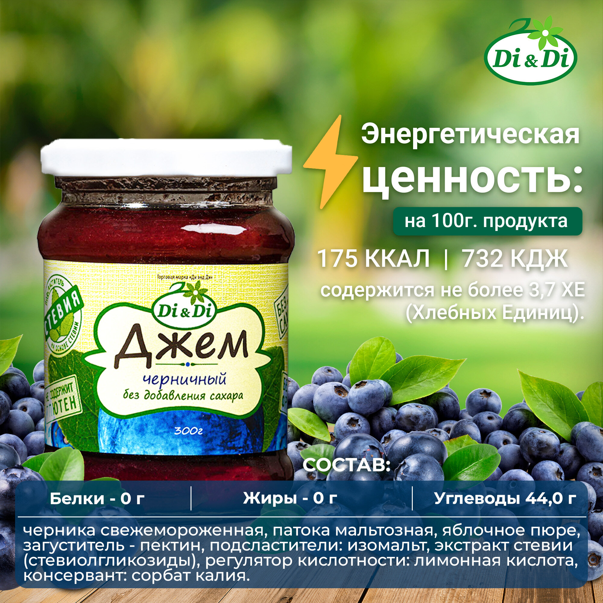 Джем черничный Di&Di, 300 гр, (без сахара, без фруктозы и без глютена) интересное: