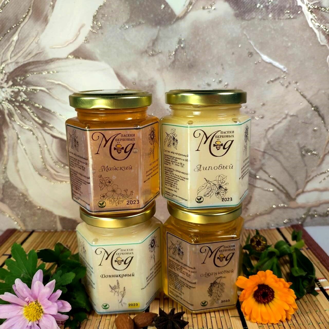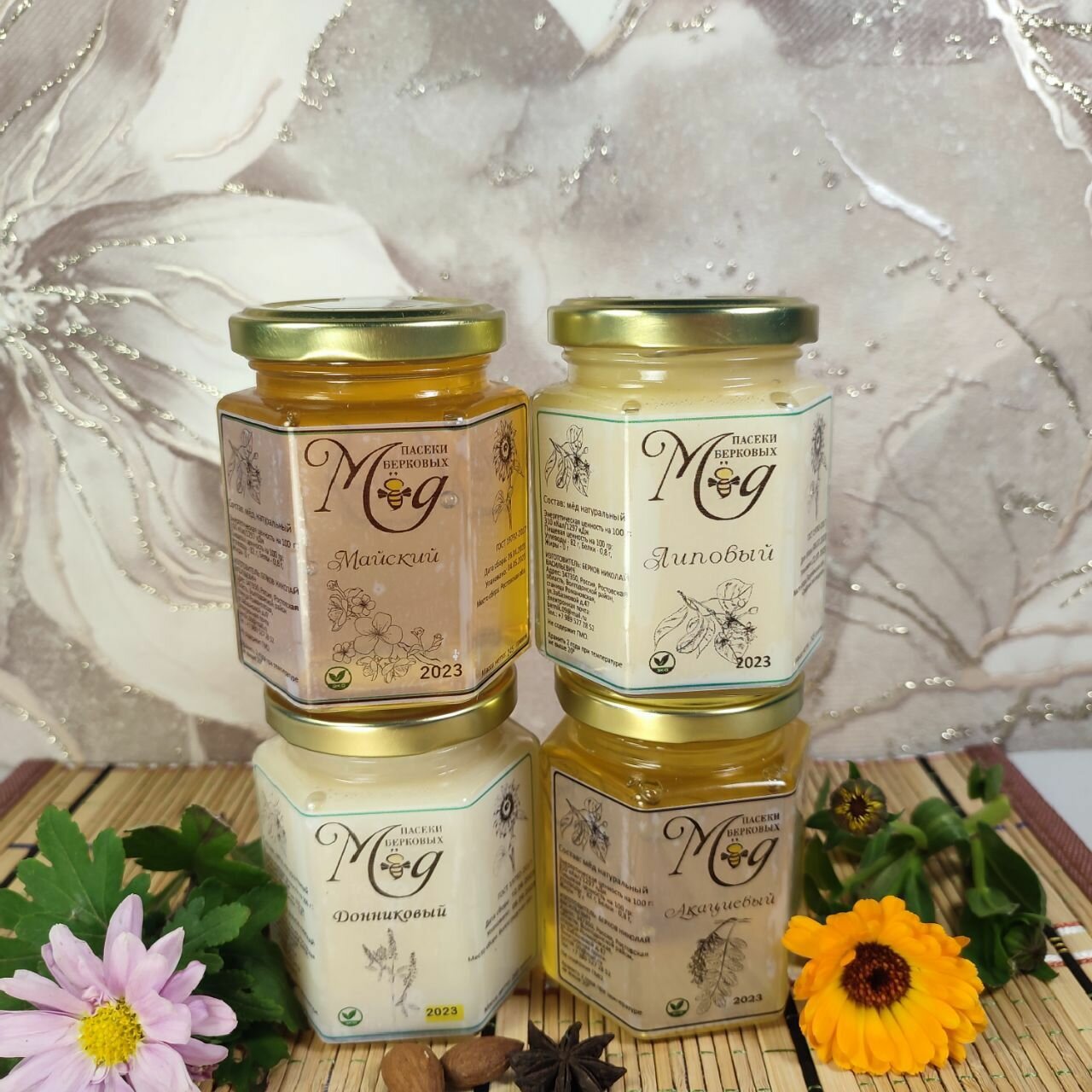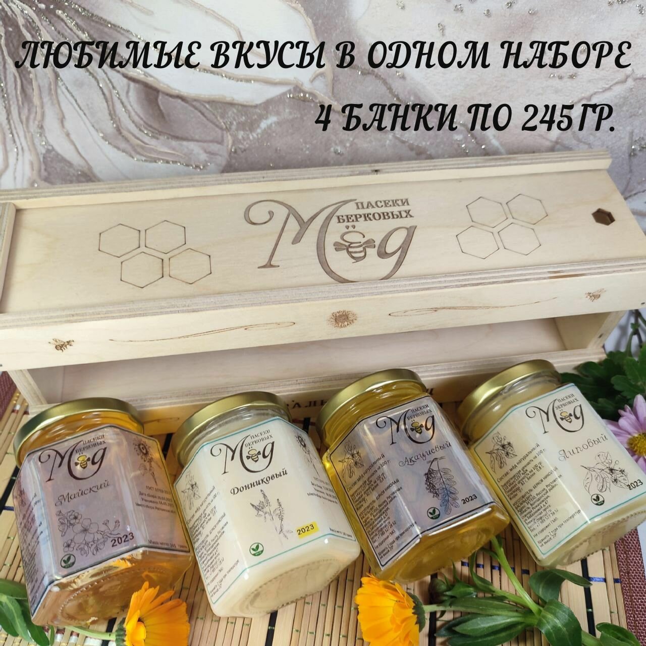 Купить Мед подарочный набор, 4х245 г, акациевый, донниковый, майский, липовый, пасека Берковых, 2023 год