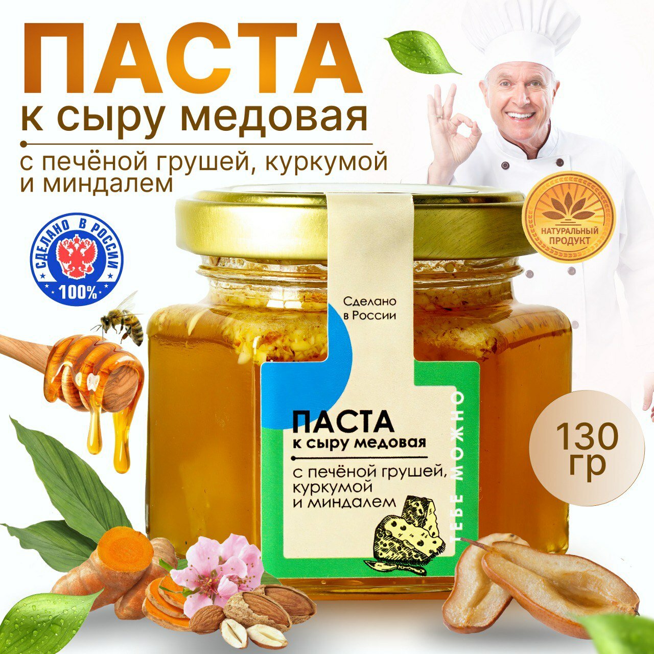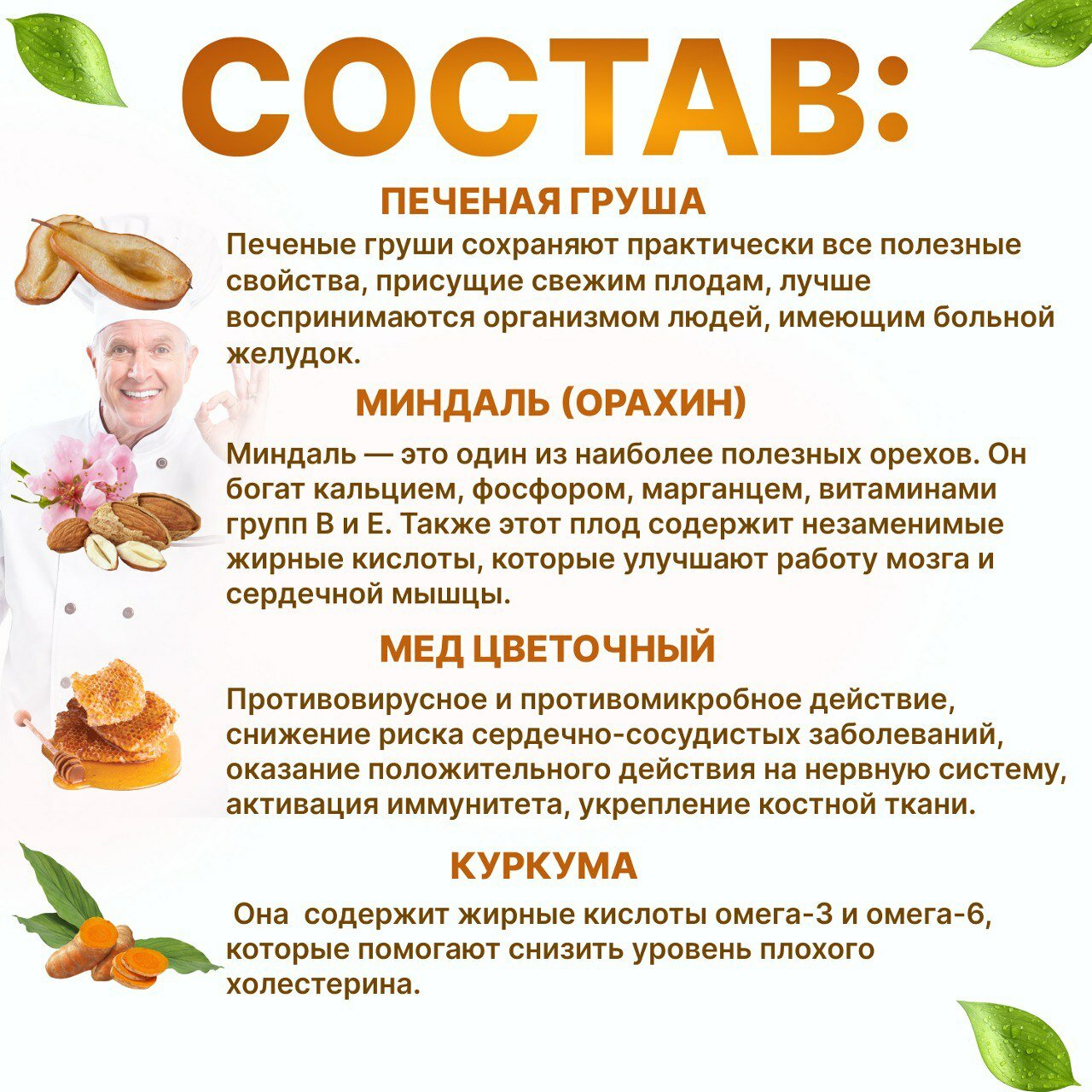 | Состав | Груша печеная, миндаль (орахин), мед цветочный, куркума |