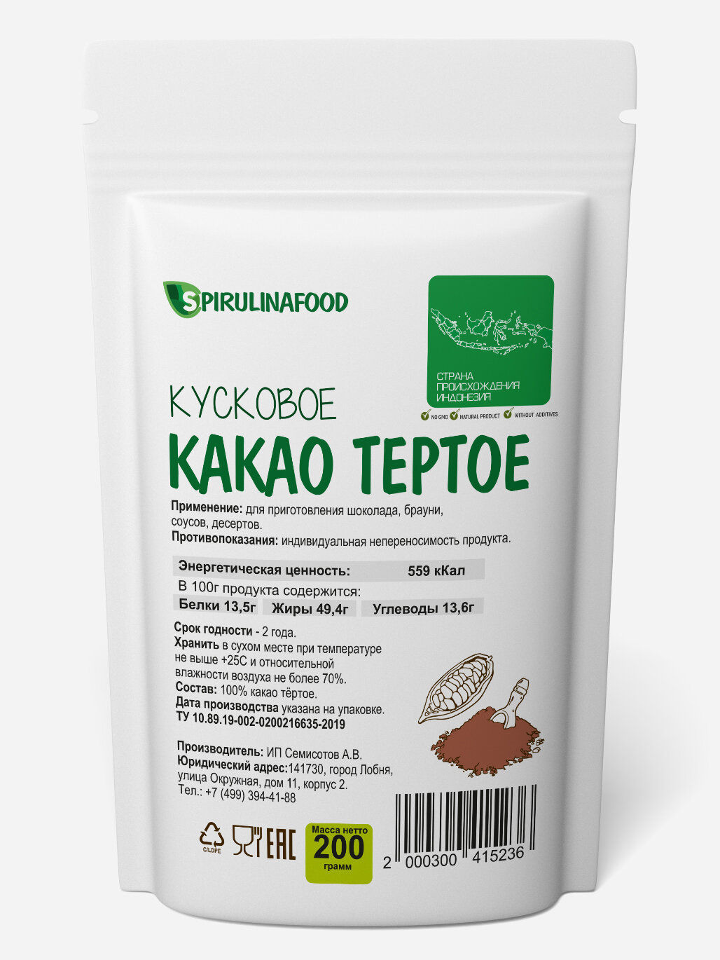 | Способ приготовления | Использование в кулинарии: для приготовления шоколада, соусов, глазури, брауни и других кондитерских изделий.Так же какао тертое можно использовать в косметических целях для различного рода масок. |