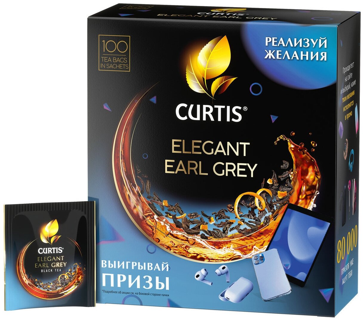 Чай черный Curtis "Elegant Earl Grey", листовой с добавками, 100 сашетов