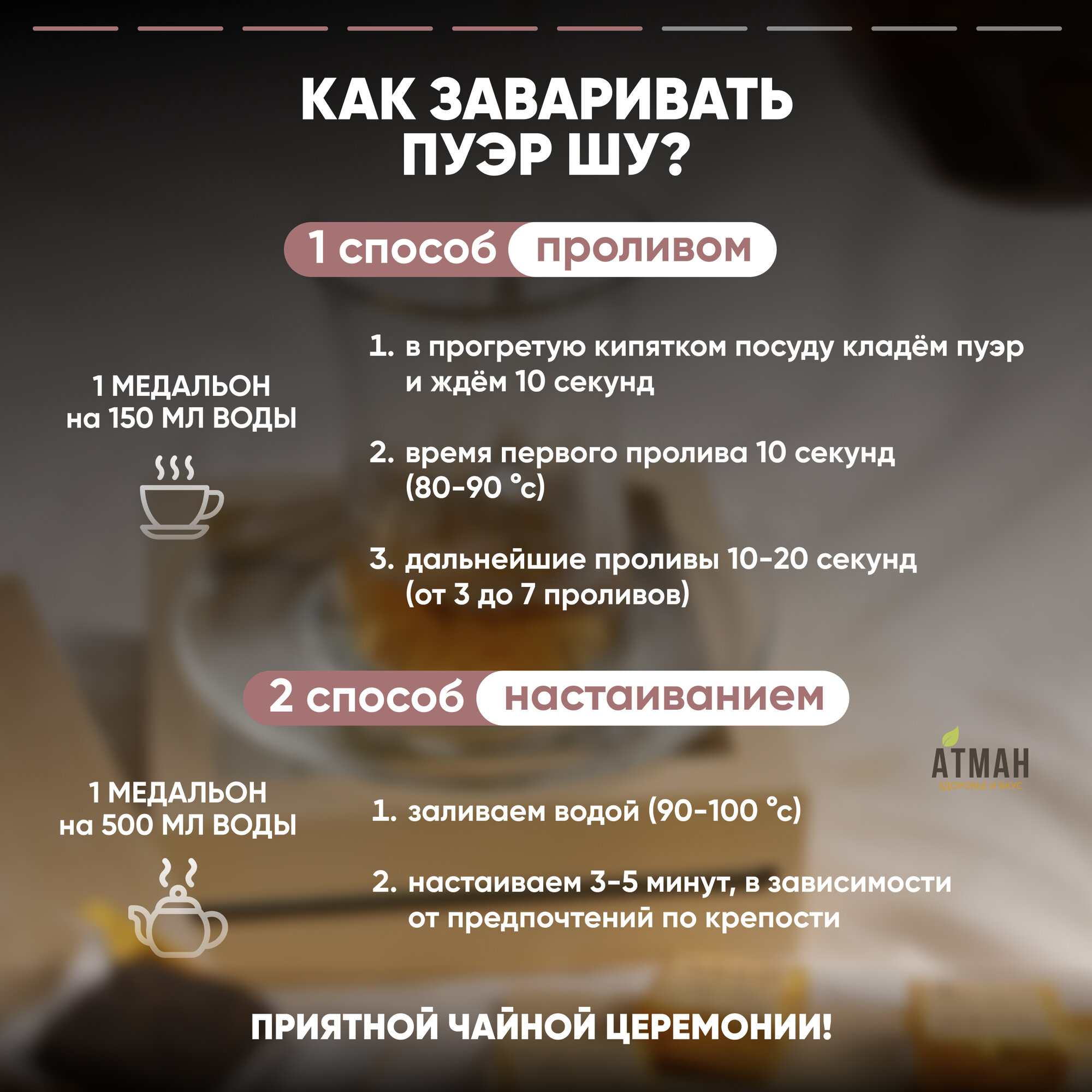 | Состав | Китайский черный чай пуэр прессованный, медальоны по 6 гр |