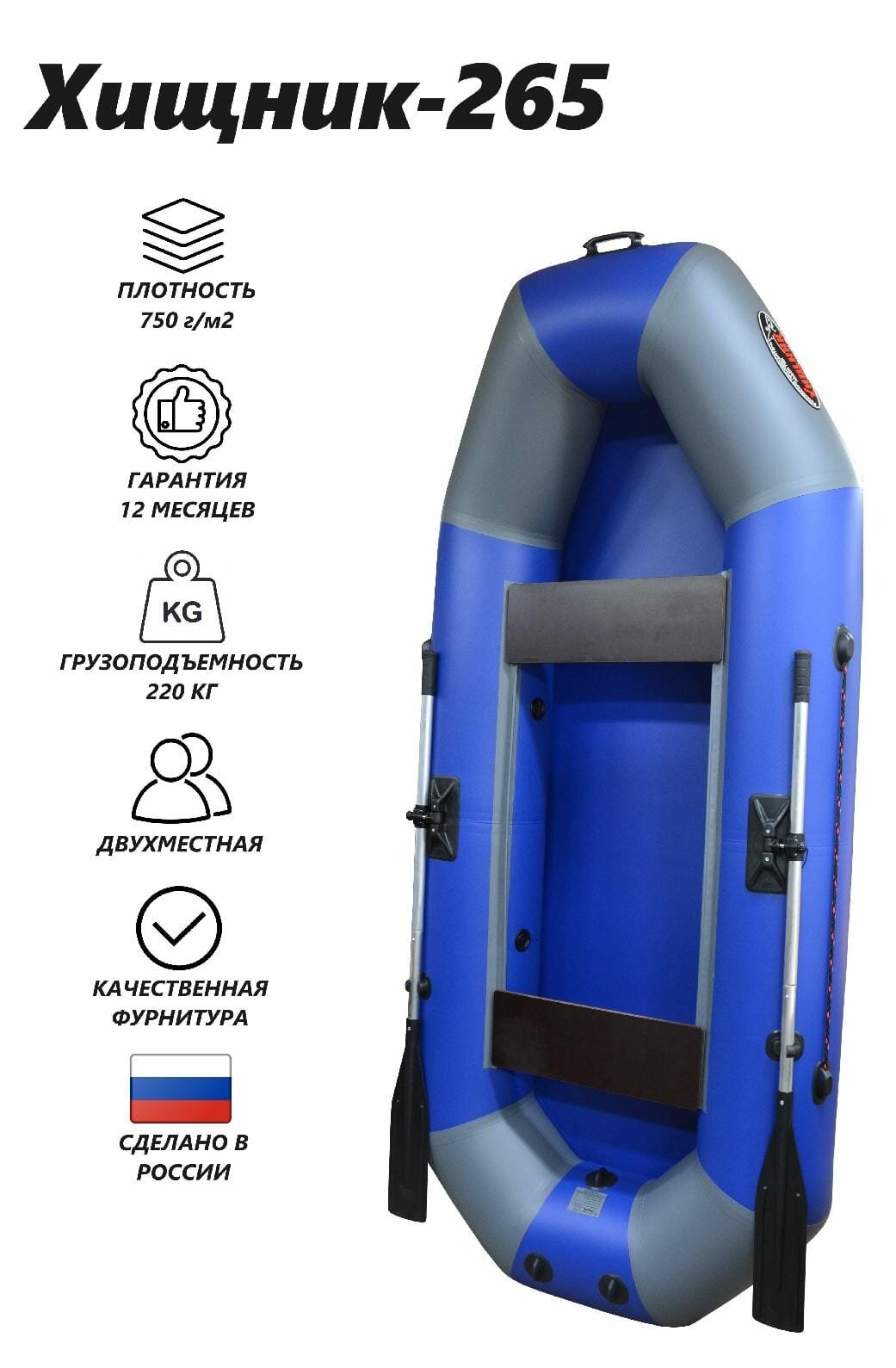 Лодка ООО Турист-Уфа "Хищник 265", ПВХ, армированная, 2 места, грузоподъемность 220кг