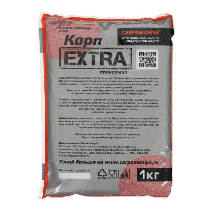 | Дополнительная информация | Данный вид прикормки применяется для различных видов ловли. Один из наиболее распространенных видов, это донная ловля с применением кормушек, различных модификаций. Приготовленную прикормку забивают в пружину, а на крючки насаживают червей, опарыша, кукурузу, горох, пенопласт. Также из готовой прикормки можно формировать шары, при этом добавлять в шары кукурузу, коноплю, горох, червей и опарыша. В последствии закидывают шары в зону ловли, рукой, рогаткой или катапультой. Для более точного прикорма зоны ловли, используют маркер. Использование: прикормка готовится в необходимом количестве путем добавления воды для увлажнения и дальнейшего набухания в течение 10-15 минут в просторной таре. После набухания добавлять воду небольшими порциями до достижения необходимой клейкости прикормки. Продукция не подлежит обязательной сертификации. Срок хранения 24 месяца. Беречь от влаги. |