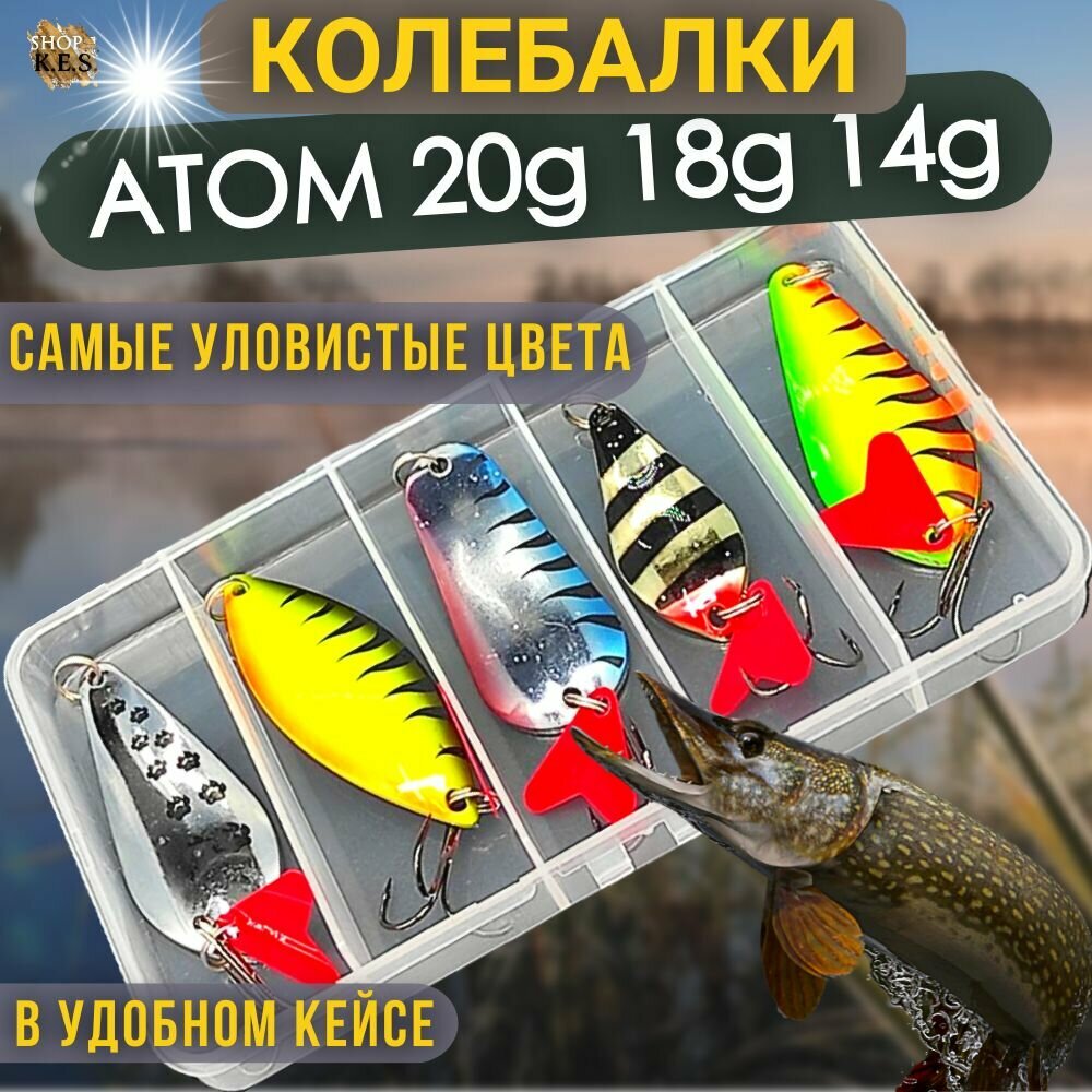 Блесна для рыбалки Атом 20гр 18гр 14гр 5шт в кейсе, набор блесен колебалок на форель,щуку,окуня,жереха,судака