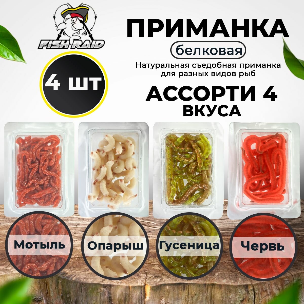 Купить Натуральная приманка Ассорти Мотыль+Опарыш+Червь+Гусеница съедобная для рыбалки белковая в блистере не искусственный