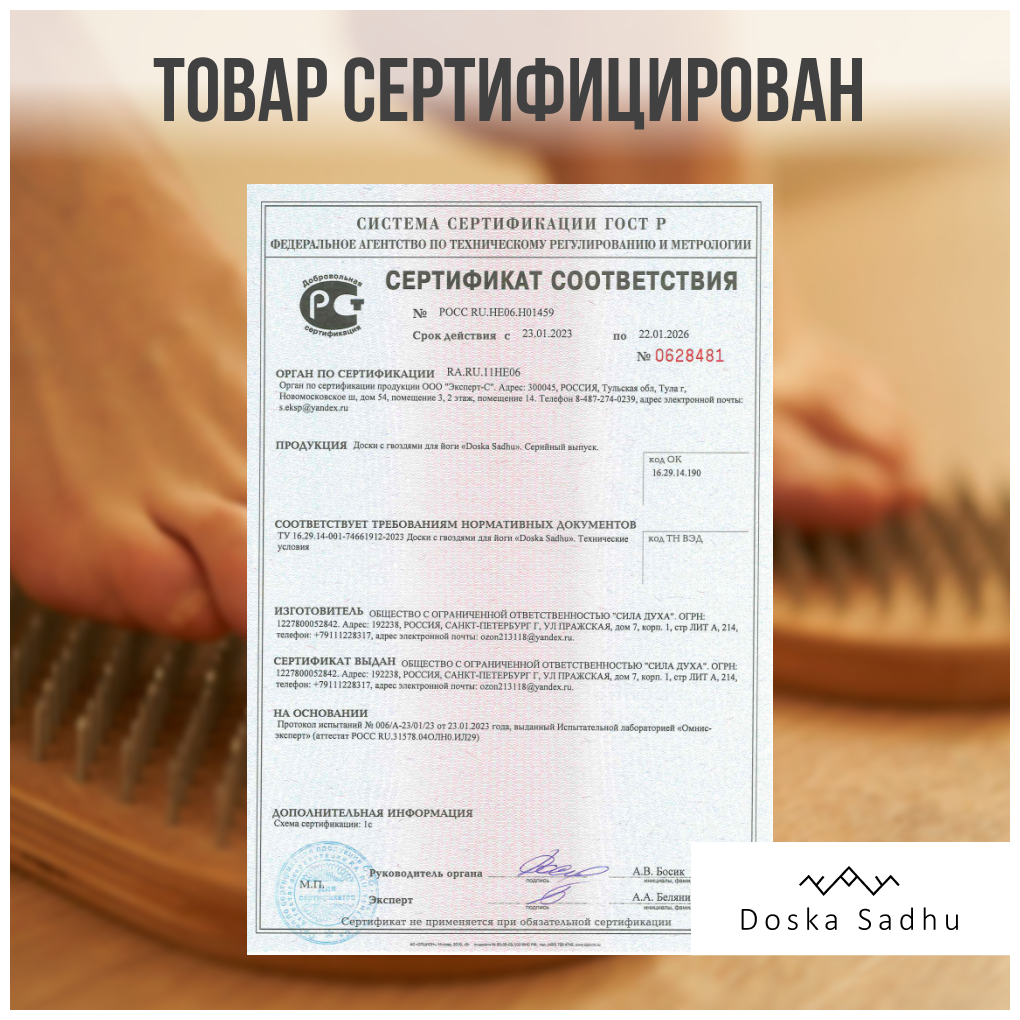 | Дополнительная информация | Доски Садху изготовлены вручную по классической технологии со статичными оцинкованными гвоздями |