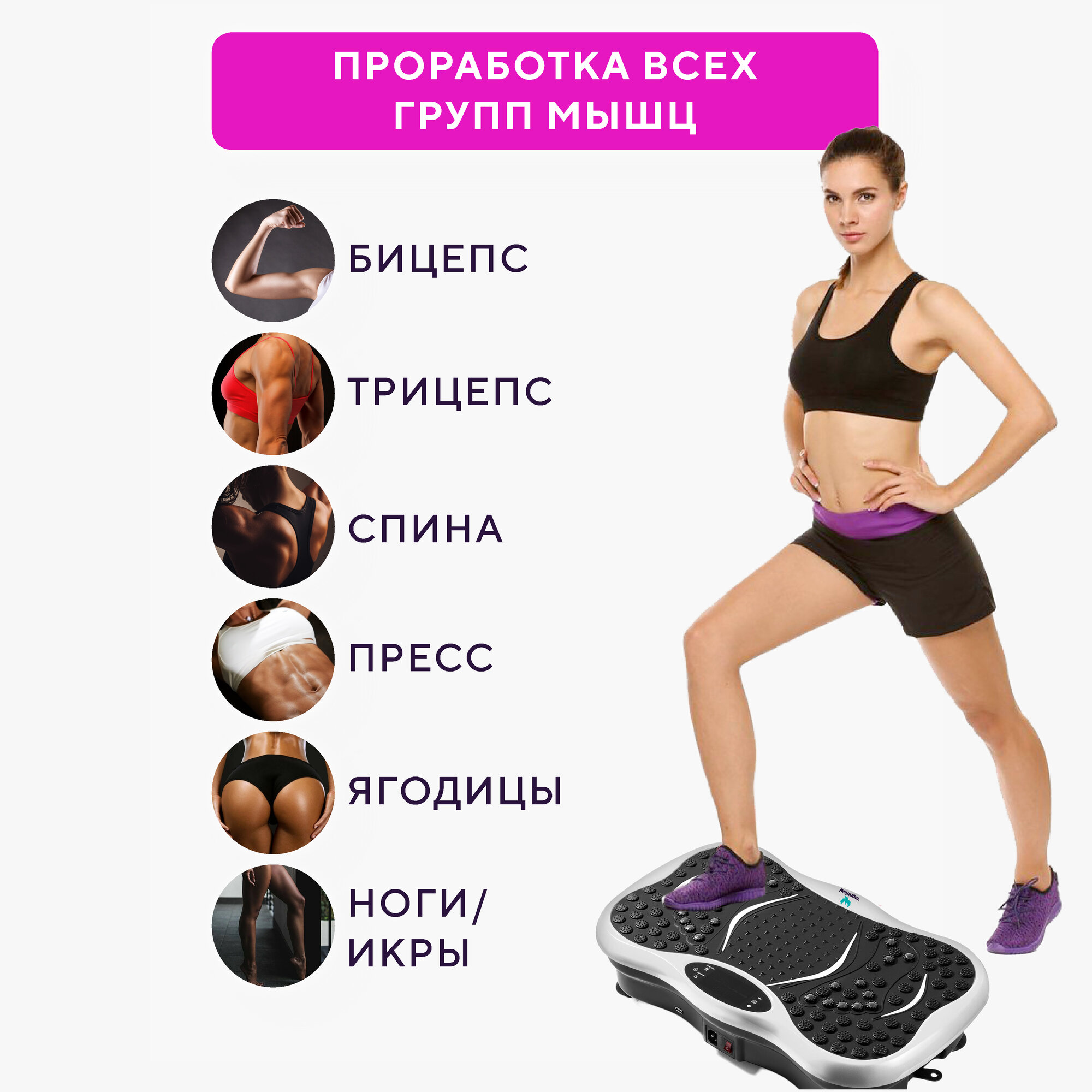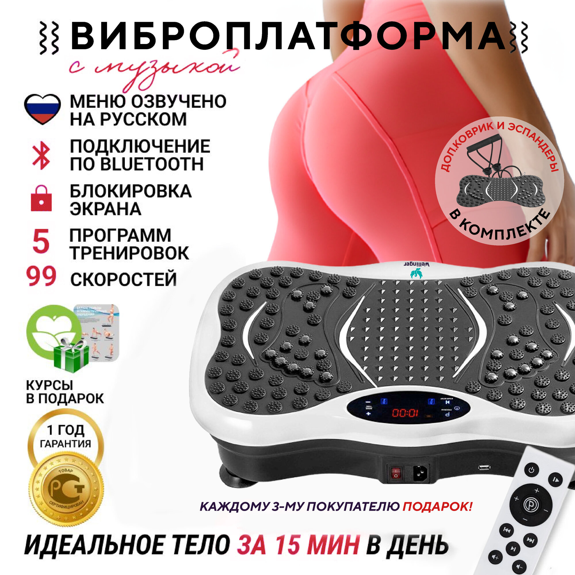 | Дополнительная информация | вибромассаж; ПОДАРОК курс тренировок и правильного питания; степпер, так же каждому 3 покупателю подарок. |