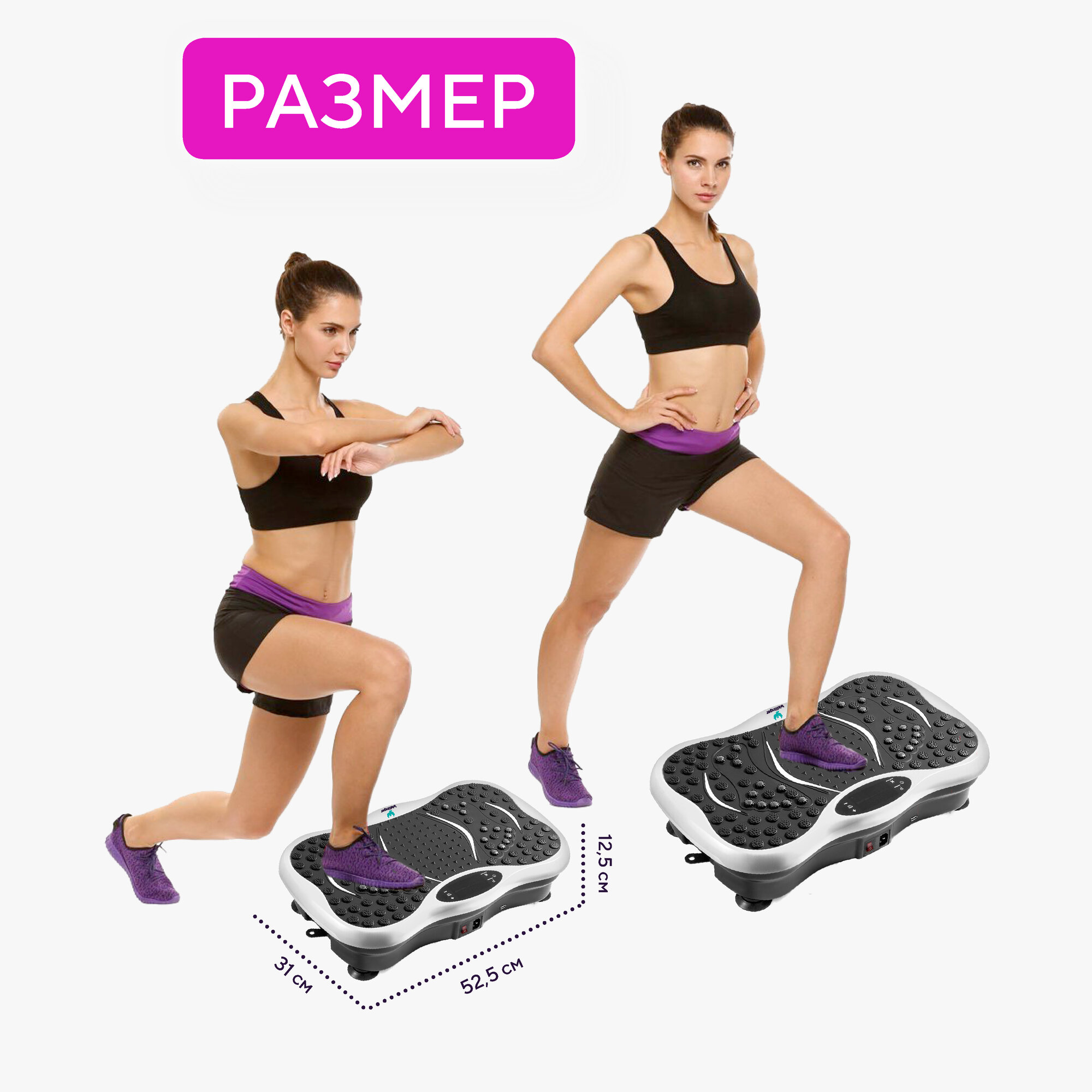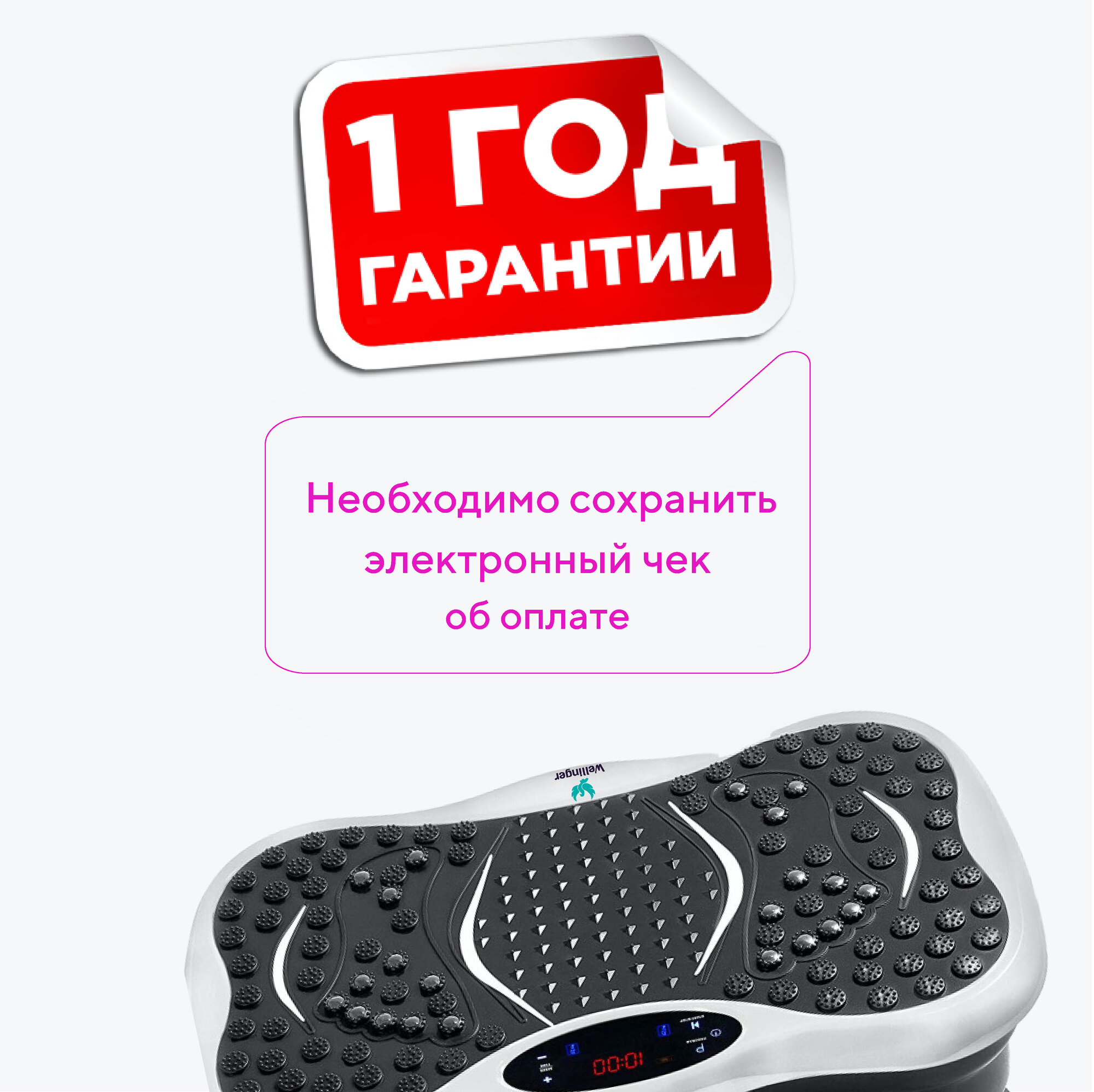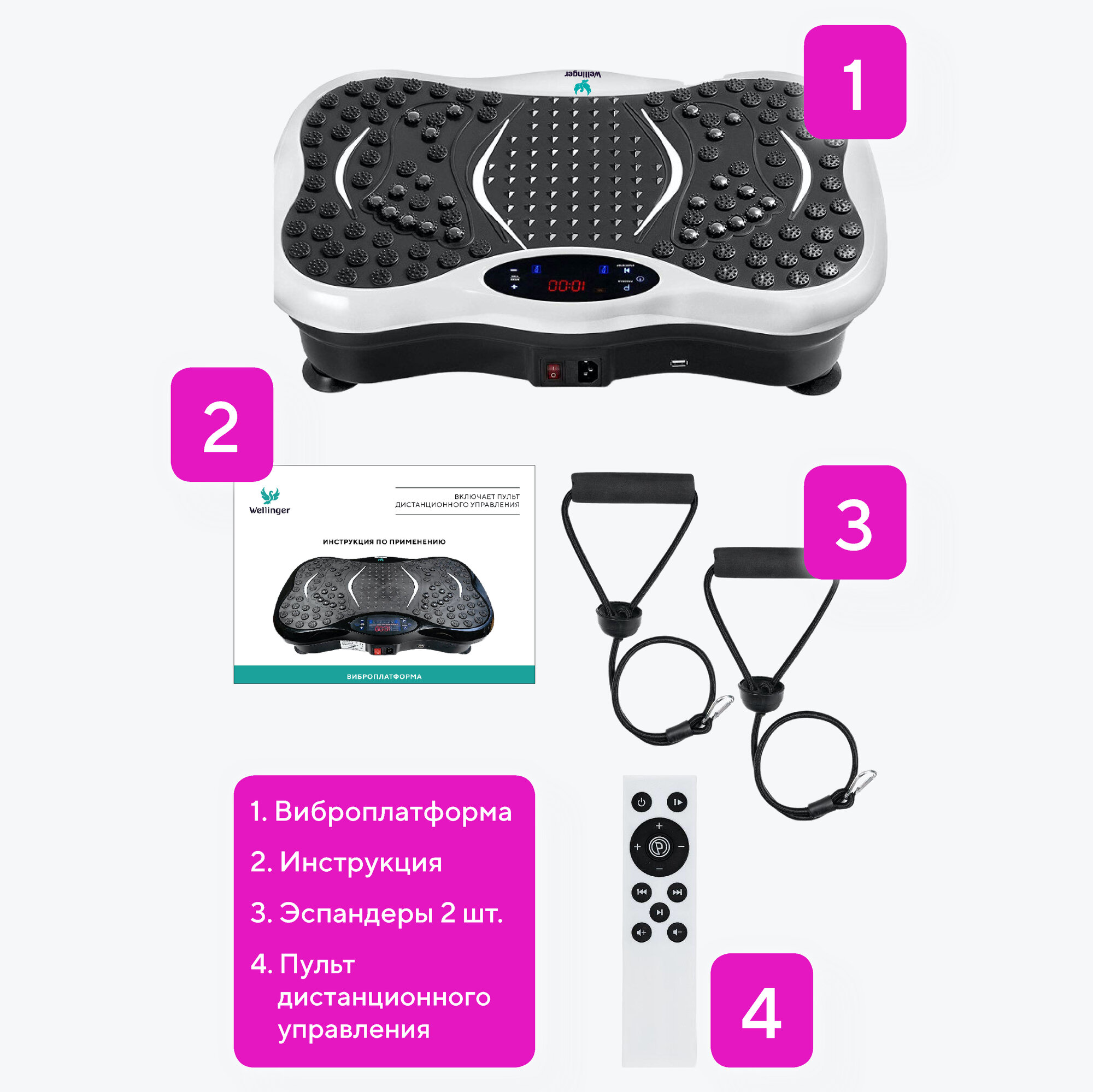 | Подробная комплектация | Виброплатформа - 1 шт; Пульт управления - 1шт.; эспандеры - 2 шт; QR-код с курсом правильного питания - 1 шт; Инструкция - 1 шт., Шнур питания - 1 шт |