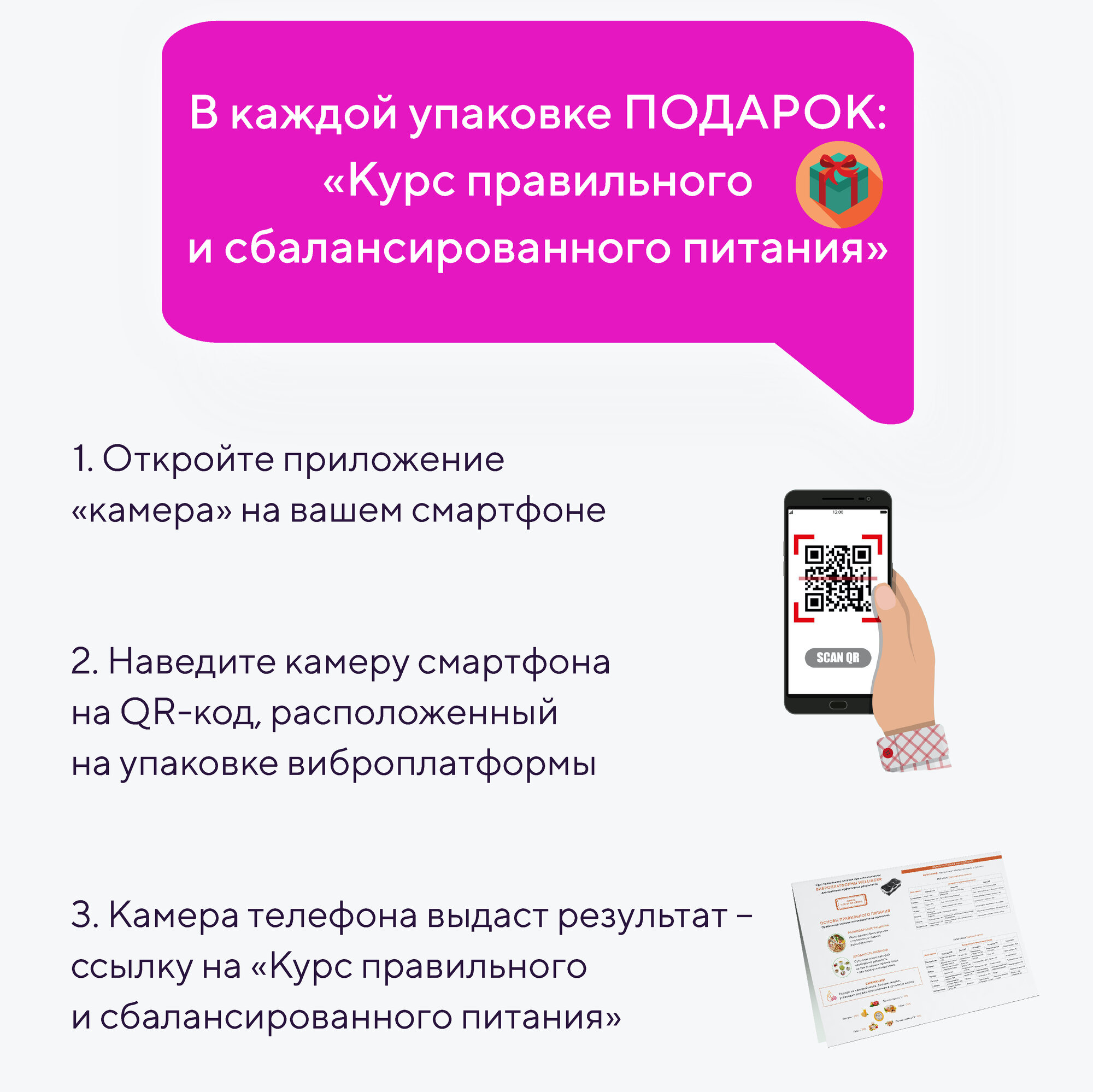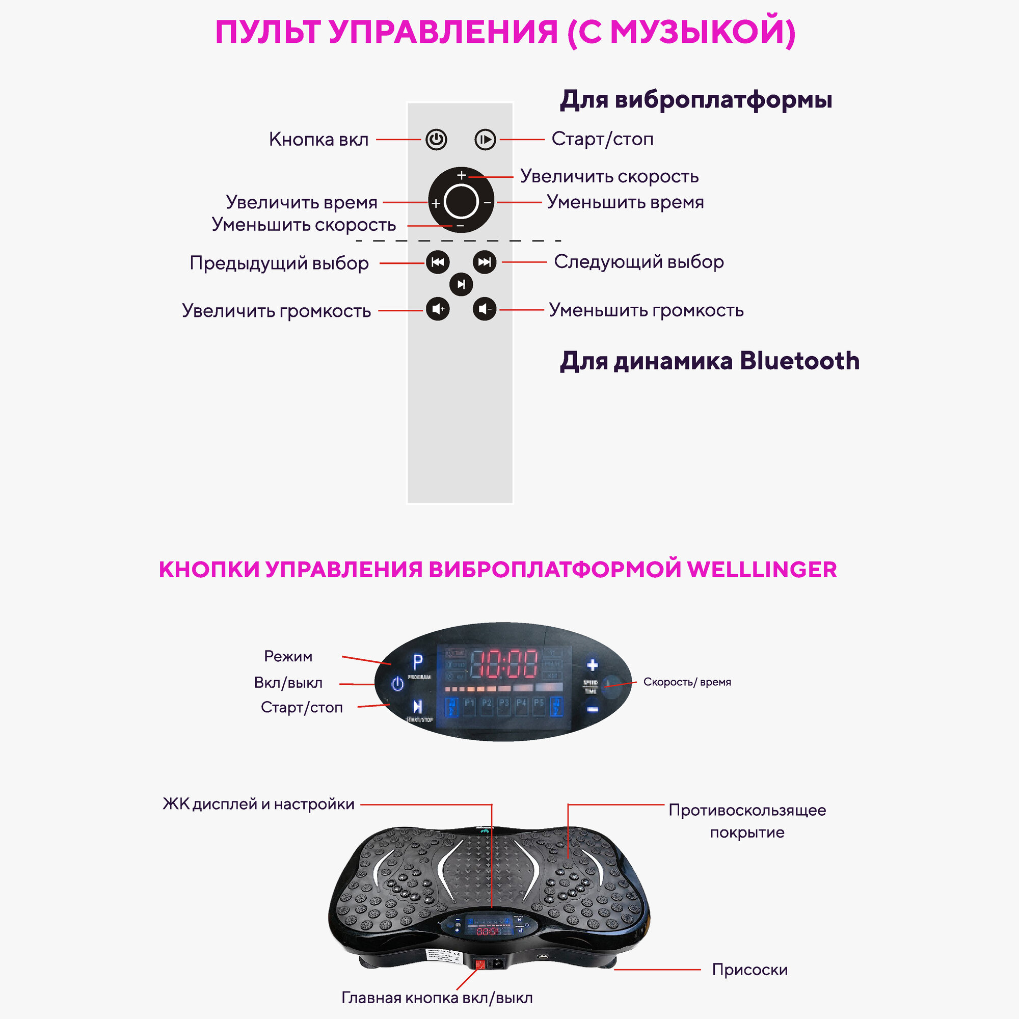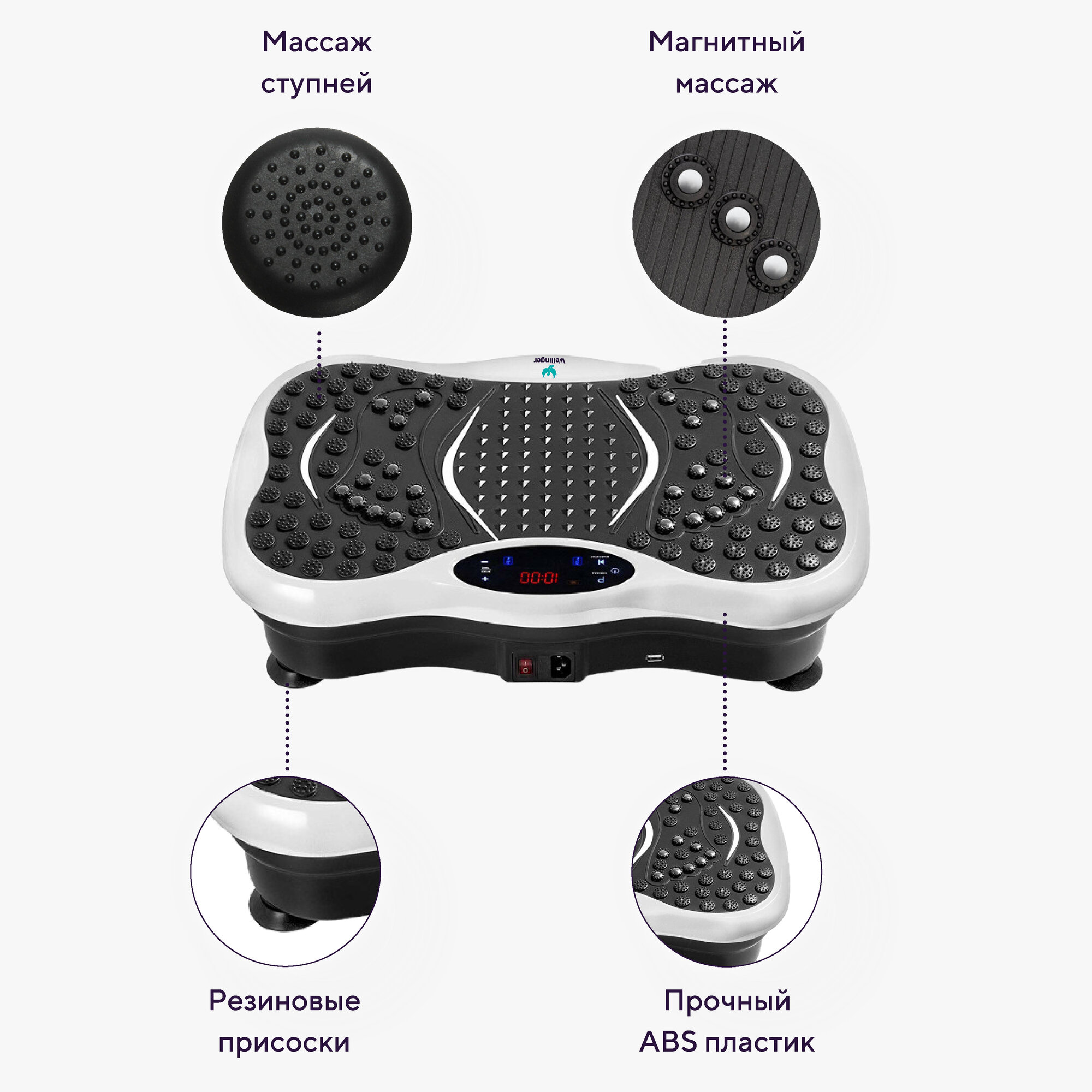 | Подробная комплектация | Виброплатформа - 1 шт; Пульт управления - 1шт.; эспандеры - 2 шт; QR-код с курсом правильного питания - 1 шт; Инструкция - 1 шт., Шнур питания - 1 шт |