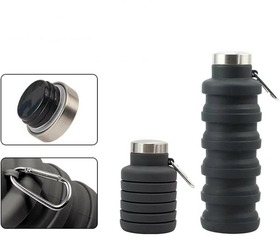 Бутылка складная силиконовая с карабином, серая