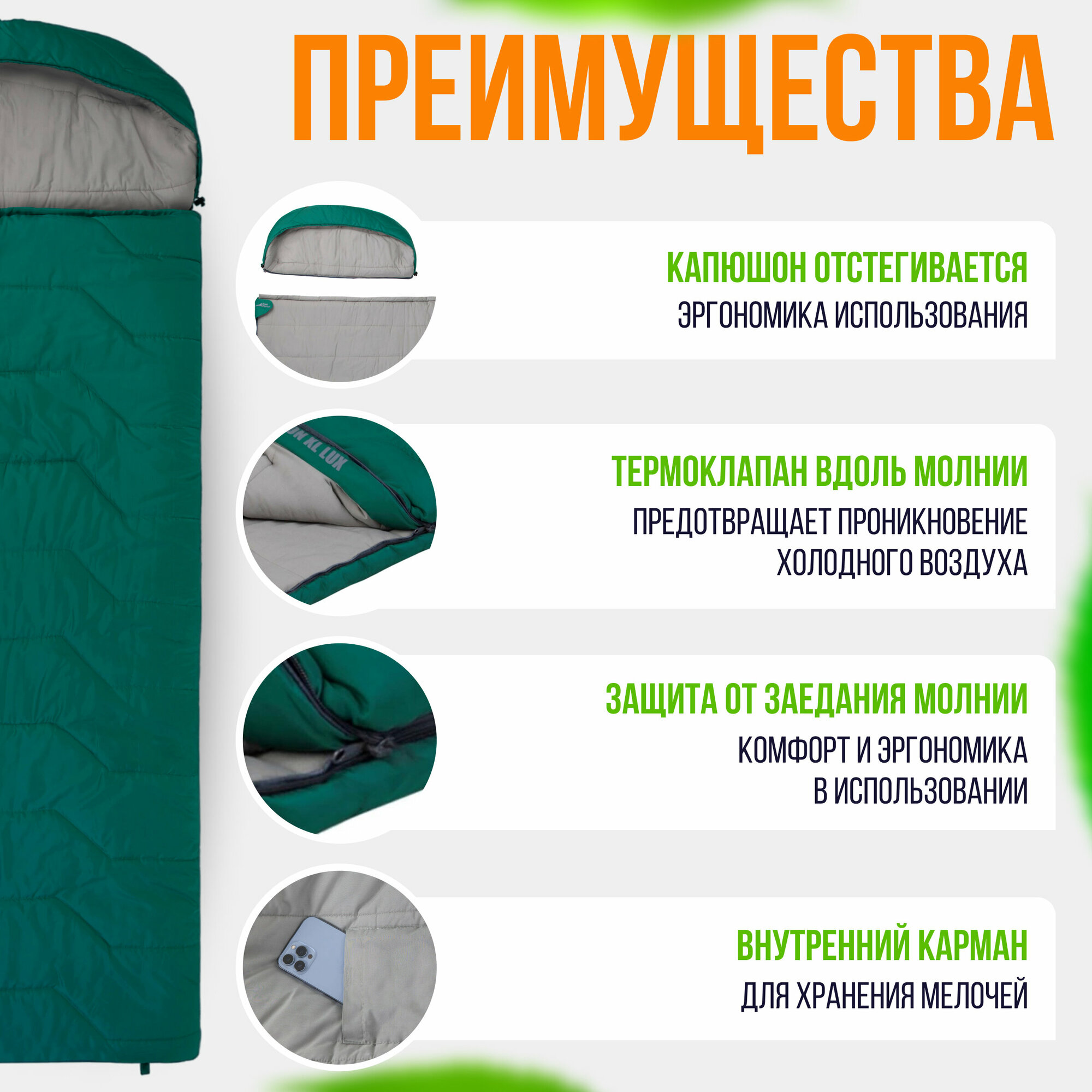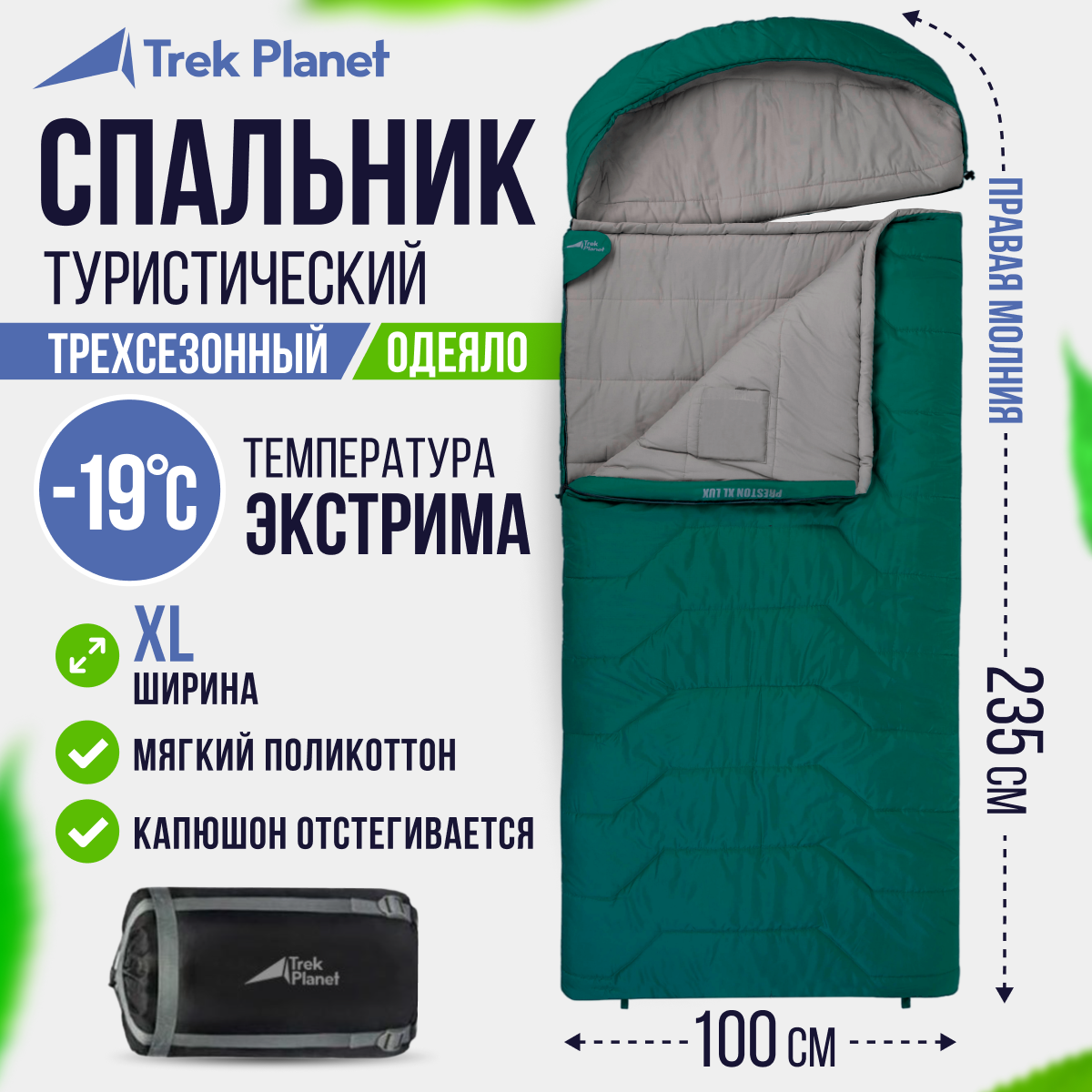 Спальный мешок TREK PLANET Preston XL LUX, правая молния, цвет: зеленый интересное: